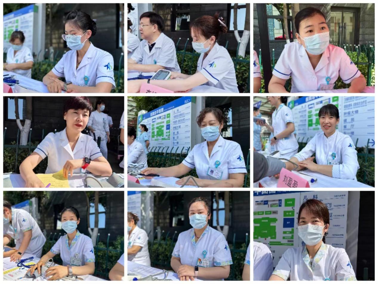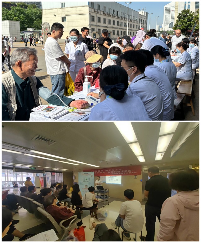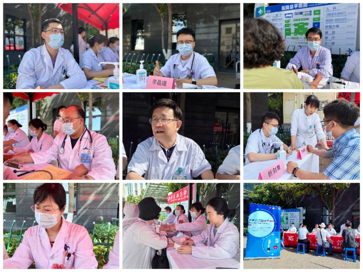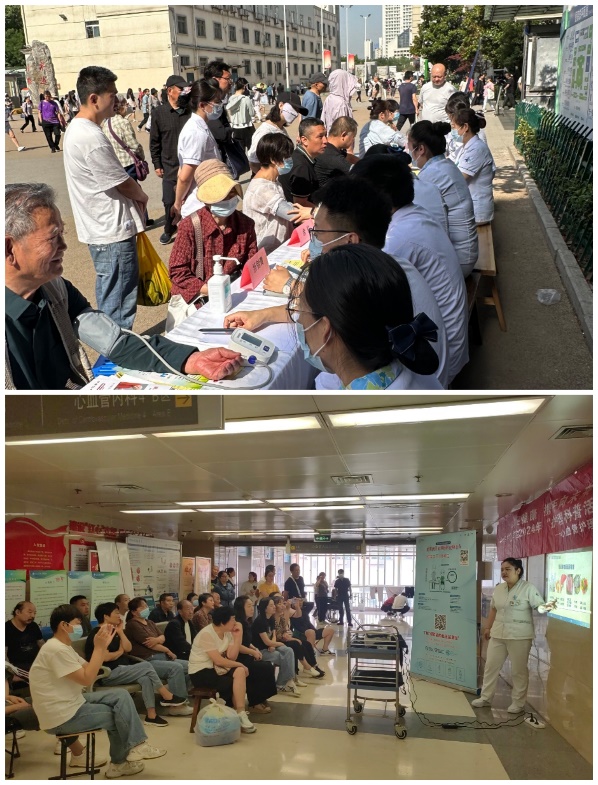 2024年5月17日上午9时我院心血管内科医护团队由心血管病院牟建军教授、陈涛教授、折剑青医师、余航医师及刘美丽护士长、李娟利护士长、刘盈盈护士长、徐战磊护士长、霍晓薇护士长等20余名医护人员于在医院门诊东侧举办高血压日大型义诊活动,现场约200余名群众参与。义诊活动分两部分:在门诊楼东侧活动现场,医护人员免费测量血压,让参与者了解自己的血压状况;通过悬挂横幅、设立宣传咨询台、心内科专家坐诊,为患者提供高血压相关的健康咨询,解答疑问,提供个性化的高血压防治建议;发放高血压防治宣传资料,内容涵盖高血压基本知识,饮食注意事项及日常保健要点,运动建议等;提供专业的高血压药物治疗的指导,包括常见降压药类型、使用原则、注意事项、特殊人群用药等。在住院部5楼大厅,由健康宣讲师王硕婕进行高血压健康知识宣教,她使用多媒体图文并茂、生动活泼的向大家进行高血压相关知识宣教,指导患者如何正确规范使用药物,同时鼓励患者重视良好生活习惯的改变。