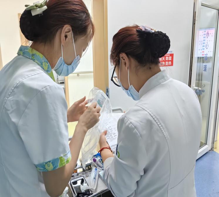 静脉输液是护理人员在临床工作中必备的操作技能之一,那么在临床工作中偶尔会遇到输液反应的发生,应该如何积极应对及处理,是护理人员应掌握的急救技能之一,快速有效的评估判断,并作出正确的处理,可以大大降低患者的伤害,将患者转危为安。为提高科室医护人员应对输液反应的处理能力。周围血管科于2024年6月19日组织进行了《住院患者输液反应应急预案演练》,演练模拟了责任护士在巡视病房时,发现患者出现输液反应的场景,该患者系腹主动脉覆膜支架腔内隔绝术后第2天,正在输注长期医嘱艾司奥美拉唑组液时,突然发生寒战、高热不适,查体可见颈部及前胸部可见皮肤片状红斑,瘙痒明显,责任护士张艳峰护士立即呼叫医生,暂停此瓶液体的输注,田庆护士立即重新建立静脉通路,更换生理盐水及新的输液器,吴乐护士核对医嘱及输液卡执行单,封存剩余液体已备检验,李利云护士立即给予患者心电监测及鼻导管吸氧,主管医生高可立即查体问诊患者,全面评估患者病情后考虑为药物引起的过敏反应,遵医嘱给予抗过敏治疗,急查血标本,同时做好患者及家属沟通工作,给予安抚情绪,严密观察患者生命体征并记录,直至患者病情稳定。