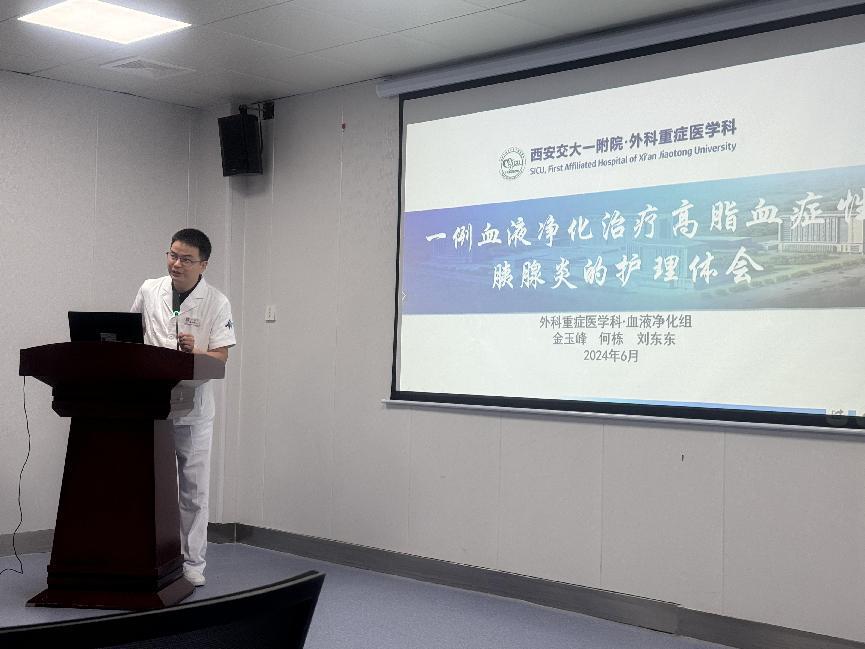 2024年7月10日下午,西安交通大学第一附属医院血液净化护理专业组在东一楼负一层会议室成功举办了一场以“一例高脂血症性胰腺炎行血液净化治疗的护理体会”为主题的精彩个案护理查房。本次活动由重症肾脏病·血液净化科刘小敏副护士长主持,受邀参与此次护理查房的领导有:韩娟总护士长、高菊林总护士长、外科ICU申存毅护士长、心内科刘盈盈副护士长、肾移植科李丹护士长、呼吸RCU巫瑞副护士长、肾内科梁嫦娥副护士长、重症肾脏病·血液净化科雷丽静副护士长、薛小红副护士长、郑明副护士长、滑卉琳副护士长,以及相关科室专业组联络员共20余人。本次活动由外科ICU血液净化专业组的成员(金玉峰,何栋,刘东东)主导,旨在通过深入探讨血液净化技术在高脂血症性重症胰腺炎(HLP)治疗中的应用与护理,进一步提升医护团队的专业素养和临床实践能力。
