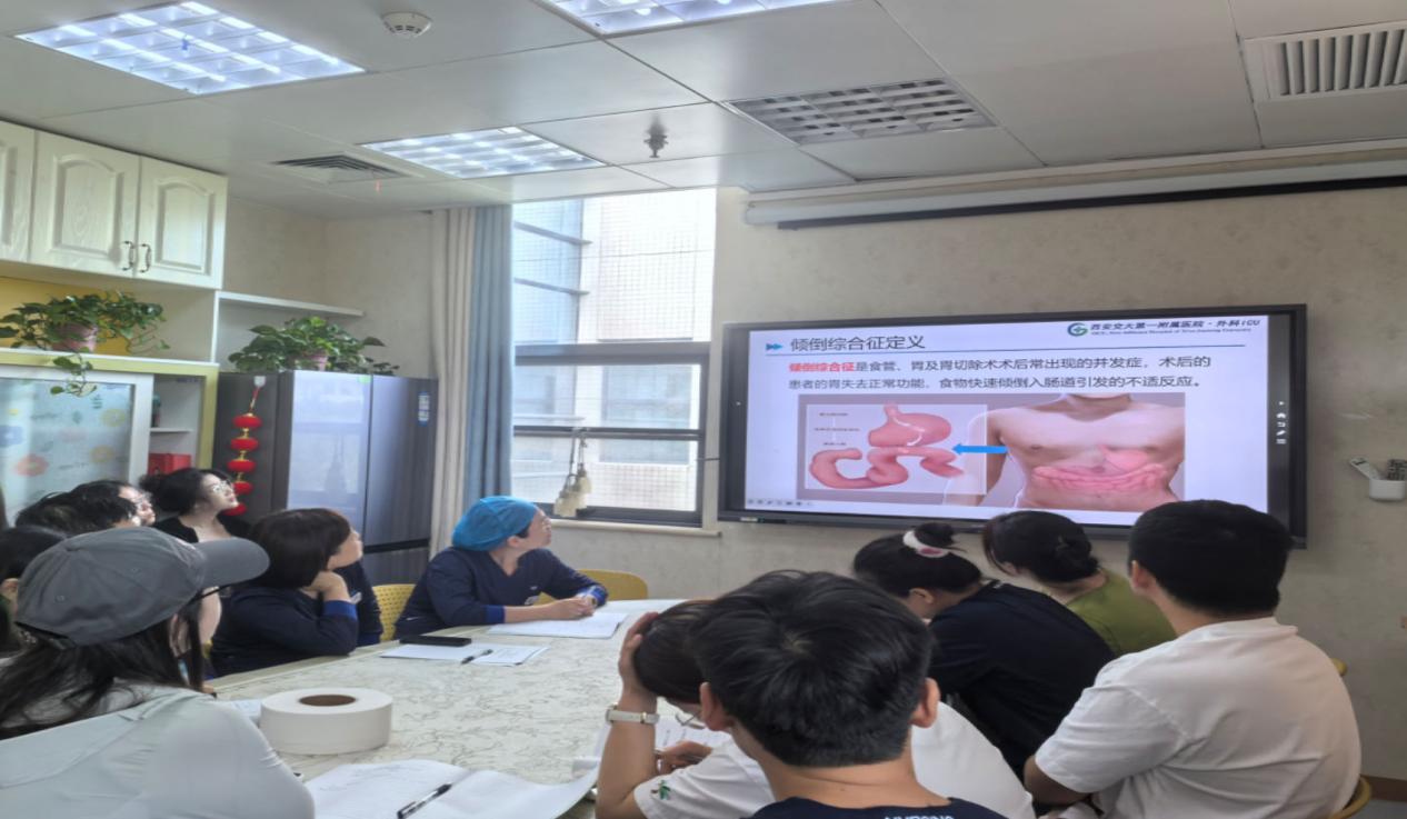 第二项是由张维主管护理师、杜晓云主管护理师以及杜浩护士围绕“一例胃大部分切除术后并发倾倒综合征患者护理查房”。首先张维主管护理师从倾倒综合征的定义、疾病分型、机制、诊断及治疗进行理论知识的培训,增加了护士的理论知识储备,为临床工作打下坚实基础。其次杜晓云主管护理师进行了病例汇报及个体化控糖方案的实施,汇报了患者的一般资料、诊疗经过以及患者出院时的修正诊断,提出了个体化的控糖方案。个体化管理更加精准,具有针对性。对于年轻护士管理特殊患者提供了宝贵经验,值得深入学习与思考。接下来由杜浩护士就如何避免倾倒综合征患者出现低血糖进行问题讨论,从低血糖的宣教、危害、饮食、心理治疗以及血糖检测的方法与特点等方面进行讨论,问题讨论内容切合病例实际特点。最后由申存毅护士长、刑斌瑜副护士长以及高年资护士点评与总结。申存毅护士长对此次查房中PPT制作、整体逻辑以及汇报整体内容给予肯定,对于不足之处提出了宝贵性的意见。通过护理查房重点解决和解决患者在护理过程中遇到的具体问题,以确保患者得到最合适的护理服务。护理查房不仅可以提升患者的护理质量,还可以为临床工作提供宝贵的工作经验。
