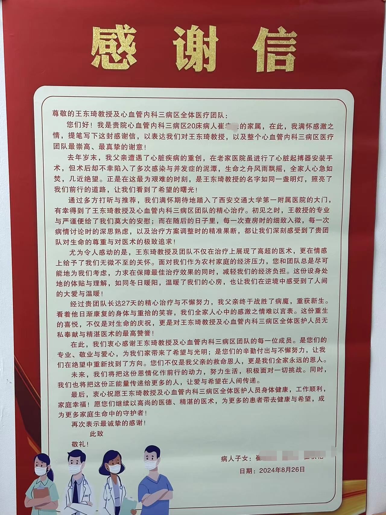 近日,心内科3病区收到一封患者及家属的感谢信,字里行间洋溢着对王东琦教授及心内科3病区医护团队无微不至治疗和关怀的感激之情,不仅温暖了医务人员的心田,也为我科“以患者为中心”的服务理念增添了生动注脚。