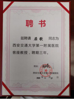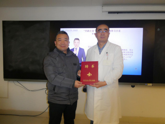 本次学术活动的第一项内容为聘书颁发仪式。首先由张少强主任亲自为屈歌教授颁发客座教授聘书。屈歌教授,首都师范大学教师,西安音乐学院特聘教授、硕士生导师,中央音乐学院嗓音声学博士,解放军总医院临床医学博士后、嗓音障碍矫治专家,中国艺术医学协会嗓音专业委员会委员,陕西省高层次人才“千人计划”长期项目入选者,西安音乐学院嗓音中心负责人,在嗓音矫治方面有很多的经验。经过前期多次的深入交流与协作,经过医院的大力支持,西安交大一附院耳鼻咽喉头颈外科与屈歌教授嗓音矫治团队成功建立了良好的战略合作关系,为后续双方更好的开展嗓音工作以及继续为西北的嗓音疾病患者带来更好更全面的治疗做出双方更大的努力。