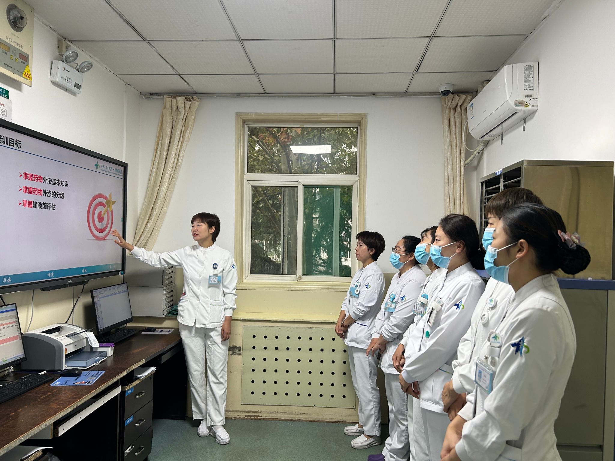 本次培训分三个阶段进行。第一阶段为理论培训,分别由王芳、张宁宁、郭盼玲三位静疗专科护士进行理论授课。三位专科护士通过PPT的方式详细向老师们介绍了外渗知识、药物外渗预防、药物外渗处理、药物外渗上报流程等内容,并结合本科室用药情况促进科室人员各位老师对外渗/渗出相关知识深刻理解,对临床输液工具、常见药物有了新的认知。