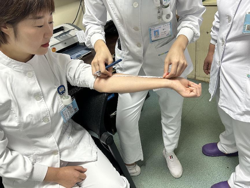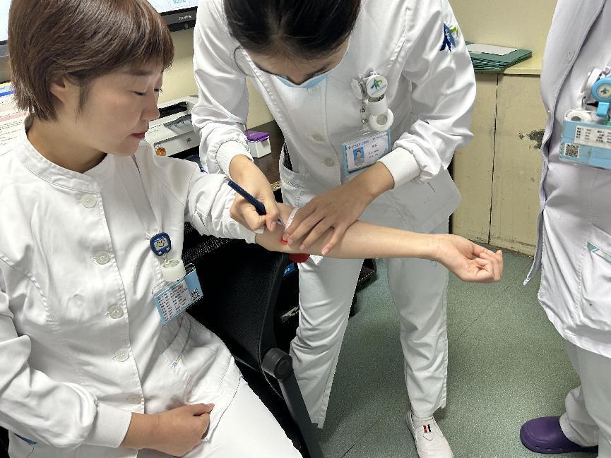 第二阶段演示指导。由谢云护士等分别针对药物外渗后测量拍照方法、化疗药物外渗封闭注射法等内容进行了现场演示和指导示范。此次培训紧扣静脉治疗行业标准,围绕静疗工作中存在的突出问题,外周静脉留置针、中心静脉置管和维护等关键知识点进行了详细讲解,进一步激发了护士们的求知欲望,营造了浓厚的学习氛围。