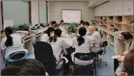 首先,王鸿雁书记进行了病理科党支部2020年度工作总结汇报。王鸿雁书记从思想政治建设、组织建设、党建带工团建设、科室文化建设等方面,全面地总结了这一年来我们党支部所做的工作和贡献,并制定了2021年度工作计划和部署安排。2020年,在全国众志成城抗击疫情的特殊时期,病理科党支部紧跟院党委的步伐,积极动员党员同志投身于医院抗疫工作的一线;认真传达和执行院党委及上级的各项文件和会议精神,利用线上线下相结合的多元化方式引导党员同志深入理论学习,全面提高支部成员的政治素养;在繁忙的工作之余组织开展科室党团员下基层活动,带领科室职工投身于基层医院的病理事业建设,不仅提升了全体党团员的党性修养,也增强了科室团队的凝聚力。通过支部的努力,科室文化建设也有了量和质的飞跃。在党支部的组织筹备下,科室开展了迎新年首届联欢会活动、首次探视已退休职工、3.8慰问女职工、拍摄小视频宣传展示疫情期间科室职工风采、探视患病职工及住院生产职工、张学斌老教授生日慰问活动、组织动员本部门职工参加第五届职工运动会以及科室全体工作人员健步走活动等。王鸿雁书记提出,在新的一年里,我们支部将继续加强组织建设和党员队伍建设,推进党建理论研究和创新实践研究,深入开展文化传承和团队建设。