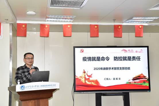 首先,由麻醉手术党支部盖毅文书记致辞。盖书记肯定了一年中,大家在抗击疫情、临床、科研、教学中取得的成绩。在目前疫情时有散发的情况下,嘱咐大家注意自我防护。期待2021年在中国共产党的坚强领导下,抗疫能尽快得到全面胜利,科室各项工作能在新的一年再上一个新台阶,一个新突破。并预祝本次年终总结大会圆满成功!