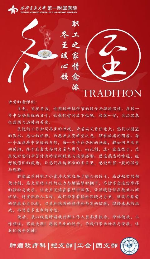 冬至,是中国传统节日中蕴含着深厚文化底蕴和家庭团聚之意的重要时刻。为了增强科室职工的凝聚力和归属感,营造温馨和谐的工作氛围,12月19日,肿瘤放疗科在科室工会主席刘锐副主任、马瑾璐副主任,李茸护士长的带领下,特别举办了此次别开生面的冬至包饺子活动。活动当天,老师们早早来到职工之家,科室医技护齐聚一堂,大家纷纷挽起衣袖,分工明确,配合默契。有的老师熟练地擀着饺子皮,薄厚均匀;有的精心调制馅料,香气四溢;更多的人则围在一起,包着形态各异的饺子,在包饺子过程中,大家相互学习、交流技巧,有的老师手法娴熟,包出的饺子形状各异、美观大方;有的则是新手,但在同事们的耐心指导下,也逐渐掌握了包饺子的要领,现场气氛热烈非凡。这其中,既有经验丰富的资深医生,也有初出茅庐的年轻护士,大家不分你我,亲如一家,在轻松愉快的氛围中共同感受着传统节日的独特魅力。窗外寒风凛冽,但肿瘤放疗科职工之家里却暖意融融,欢声笑语不断。