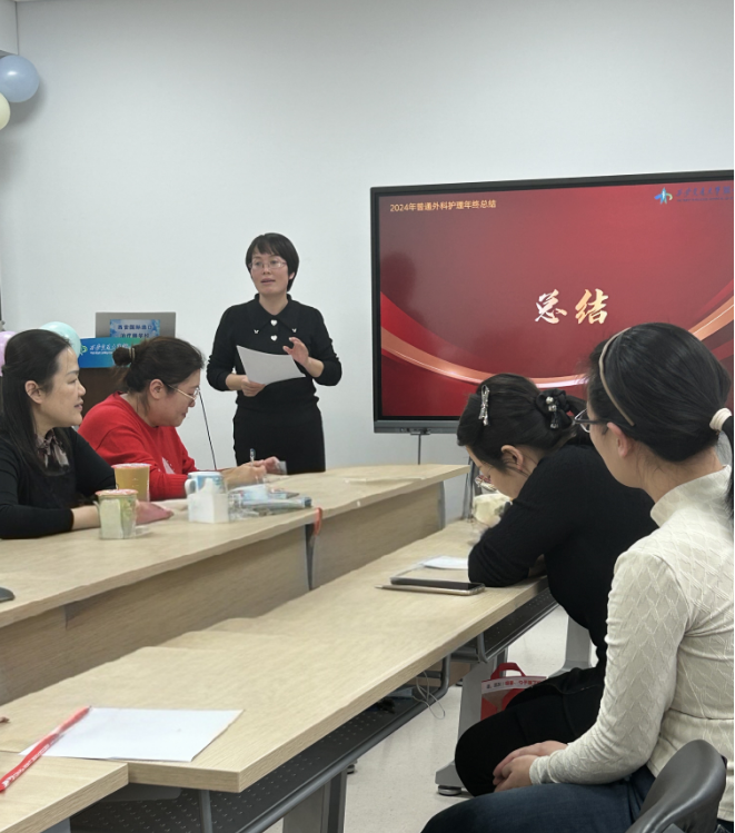岁序常易,华章日新。值此辞旧迎新之际,为夯实2025年护理工作根基,全力提升护理服务品质,普通外科于2024年12月22日周末之际,精心组织召开本年度“两院四区”工作总结会议。会议由宋钰护士长主持,孙学军主任、王曙逢副主任、樊林副主任分别致辞,其辞恳情真,既高度褒扬往昔护理佳绩,又智珠在握,倾付未来期许,全体护理人员齐聚一堂,共襄盛会。