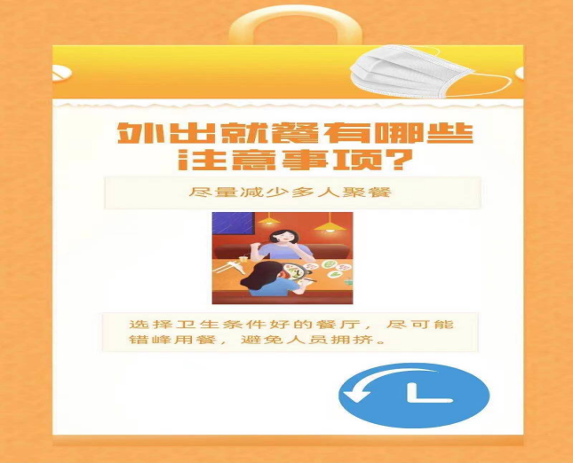 就餐中 尽量减少接触公共设施,如需排队取餐,注意保持1米距离;多人围桌合餐,使用公筷、公勺或分餐制。