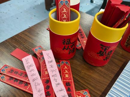紧接着,进入了一个充满惊喜与期待的环节——抽取新年“上上签”。大家纷纷在签筒内,抽取属于自己的新年祝福。这些“上上签”不仅承载着美好的寓意,更寄托着大家对新年的无限憧憬与希望,为这场茶话会增添了一份别样的欢乐与祥和。