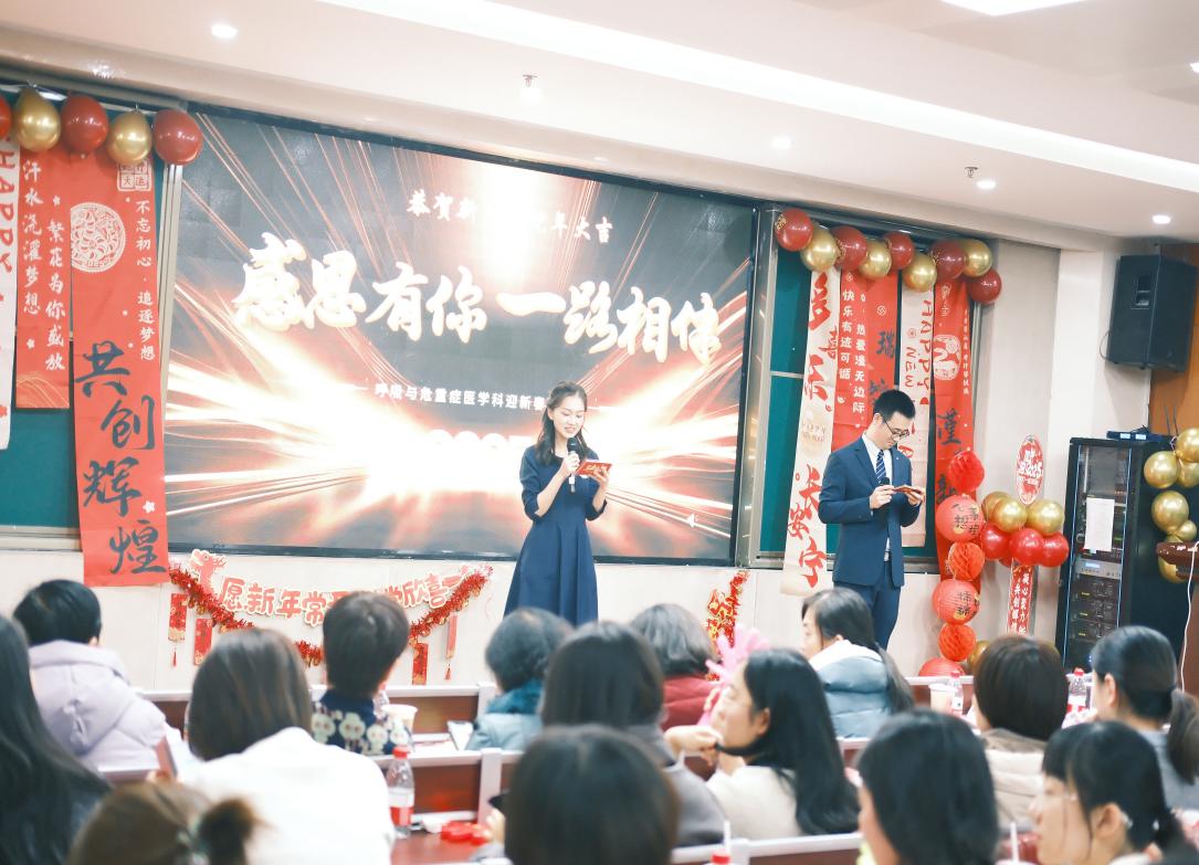 新春佳节渐近,由呼吸与危重症医学科工会、党团支部前期筹备,精心组织策划,于1月17日在科教楼101成功举办了一场主题为 “聚势而上,扬帆起航” 2025年迎新春联欢晚会活动。青工部部长、团委任冯刚书记与呼吸与危重症医学科全体医护人员共计200余人欢聚一堂,共同回顾2024年的奋斗历程,展望2025年的新征程,现场气氛热烈,温情四溢。