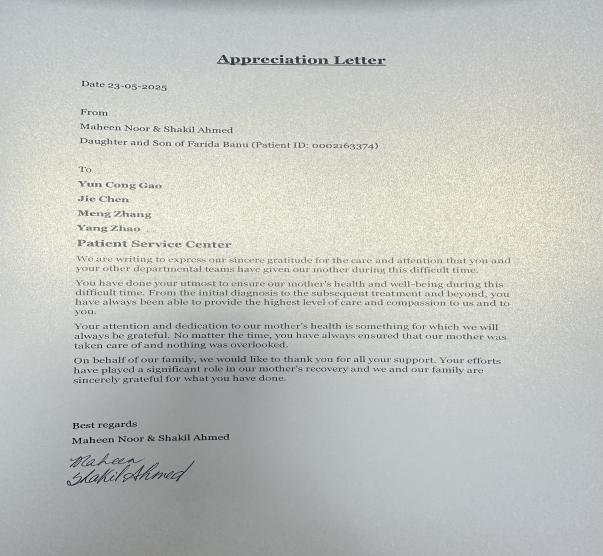 在长达一个月的就医过程中,患者服务中心团队的专业与温暖深深打动了Shakil一家。感谢信中写道:“从诊断到治疗,你们始终以最高水平的关怀守护我们的母亲。你们的奉献是我们家庭永远铭记的恩情。”更值得一提的是,Shakil已与高韵丛老师建立长期联系,并透露未来将有更多孟加拉国患者通过患者服务中心的协助前来就医。“这里不仅治愈疾病,更传递了跨越国界的善意。”他感慨道。