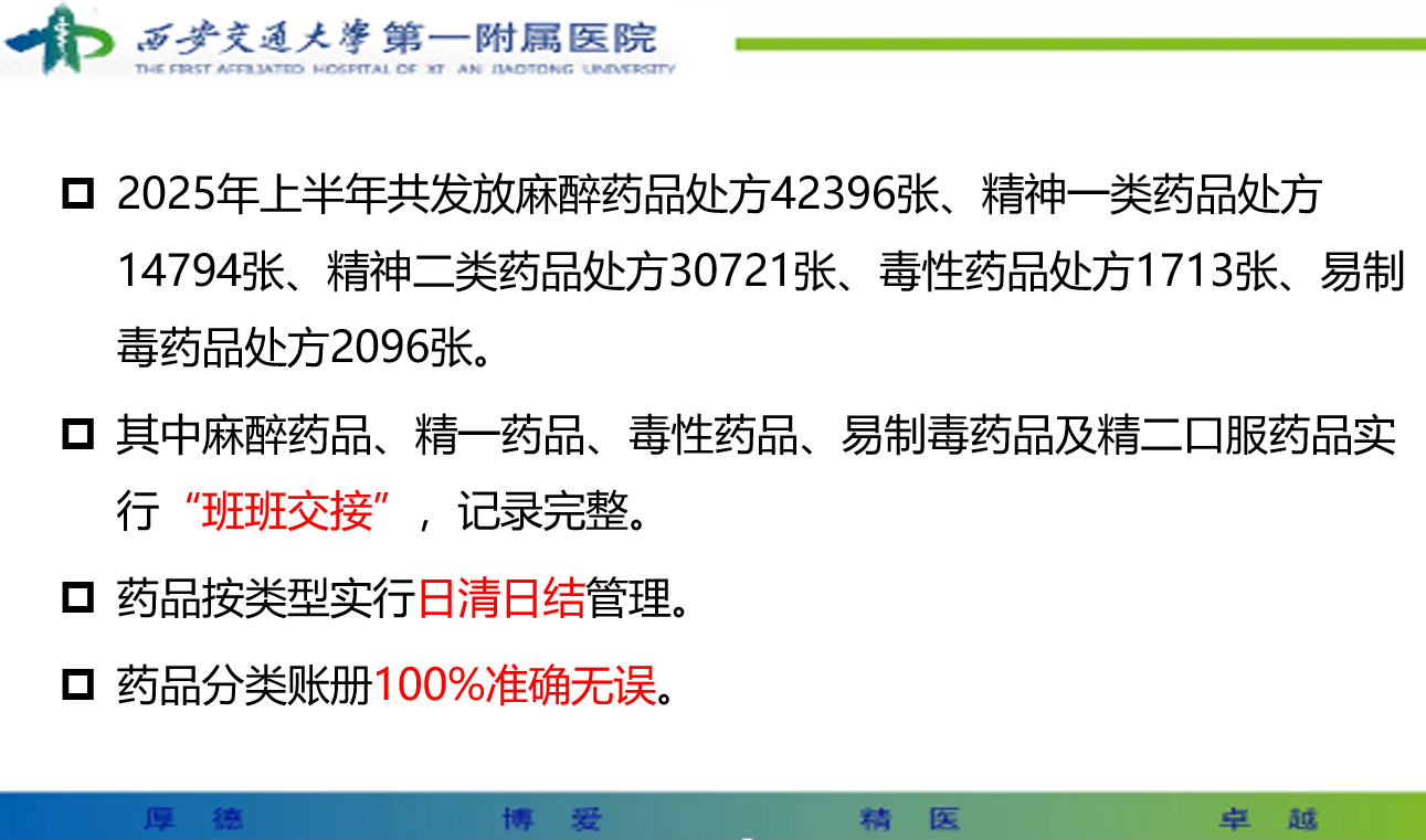 张允文药师首先围绕国家卫健委颁布的《处方管理办法》《医疗机构麻精药品管理规定》等核心法规,针对住院药房在麻精药品的管理、领用、存储、交接、发放、回收、销毁等全流程进行了严格对标。之后,对近期滞销和即将撤市的药品的后期处置计划进行了通报。随后,分析了住院药房上半年麻精处方的规范性和合理性。强调目前在处方前记中,有两个需要关注的问题,一个是两岁以下儿童需要填写体重;另一个是代办人身份证一栏,除没有身份证的新生儿需要填写以外,其他住院患者均不需要填写。在处方审核时,要关注重症患者的药物用量,在保证患者及时用药的同时,又要避免处方超期、药物滥用的问题。