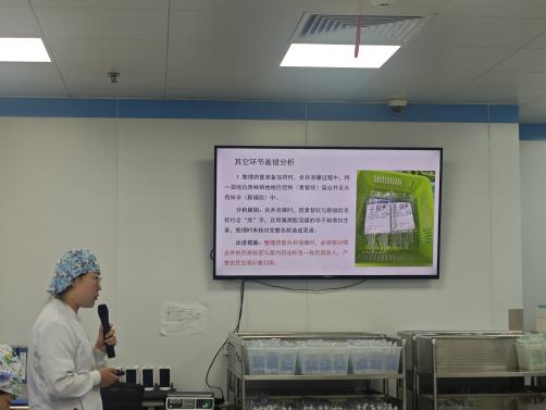 其次是药、护质控汇报。梳理上月调配流程中的关键环节,聚焦细节,找准症结,对各个差错逐一分析原因,并提出改进措施。及时优化“双人复核”流程,以“零差错”为目标,围绕“操作规范要点”与“工作环境卫生细节”两大核心,通过复盘上月情况,明确改进方向,把规范操作融入每一个环节,切实保障静脉用药调配质量。