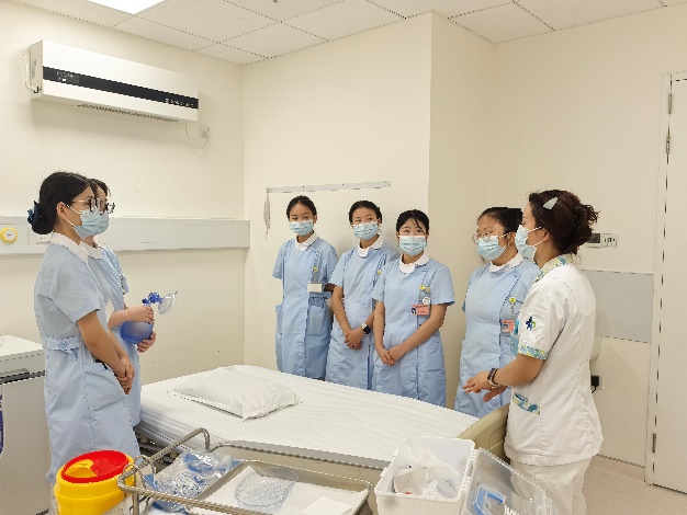 随着实习推进,技能实操成为重点。第二周开始,雾化吸入、皮下注射、输液泵的使用、心肺复苏、简易呼吸气囊的使用、除颤仪的使用等操作教学有序开展。带教老师秉持 “放手不放眼” 原则,手把手指导。静脉输液时,针对老年患者脆弱血管,传授 “轻摸、慢压、稳进针” 技巧;动脉采血前,先教如何用话语安抚患者紧张情绪,再手把手教同学们如何固定动脉、以什么角度进行穿刺。每一次穿刺、每一回操作,都是技能与耐心的双重修炼,让实习生从 “会做” 迈向 “做好” 。