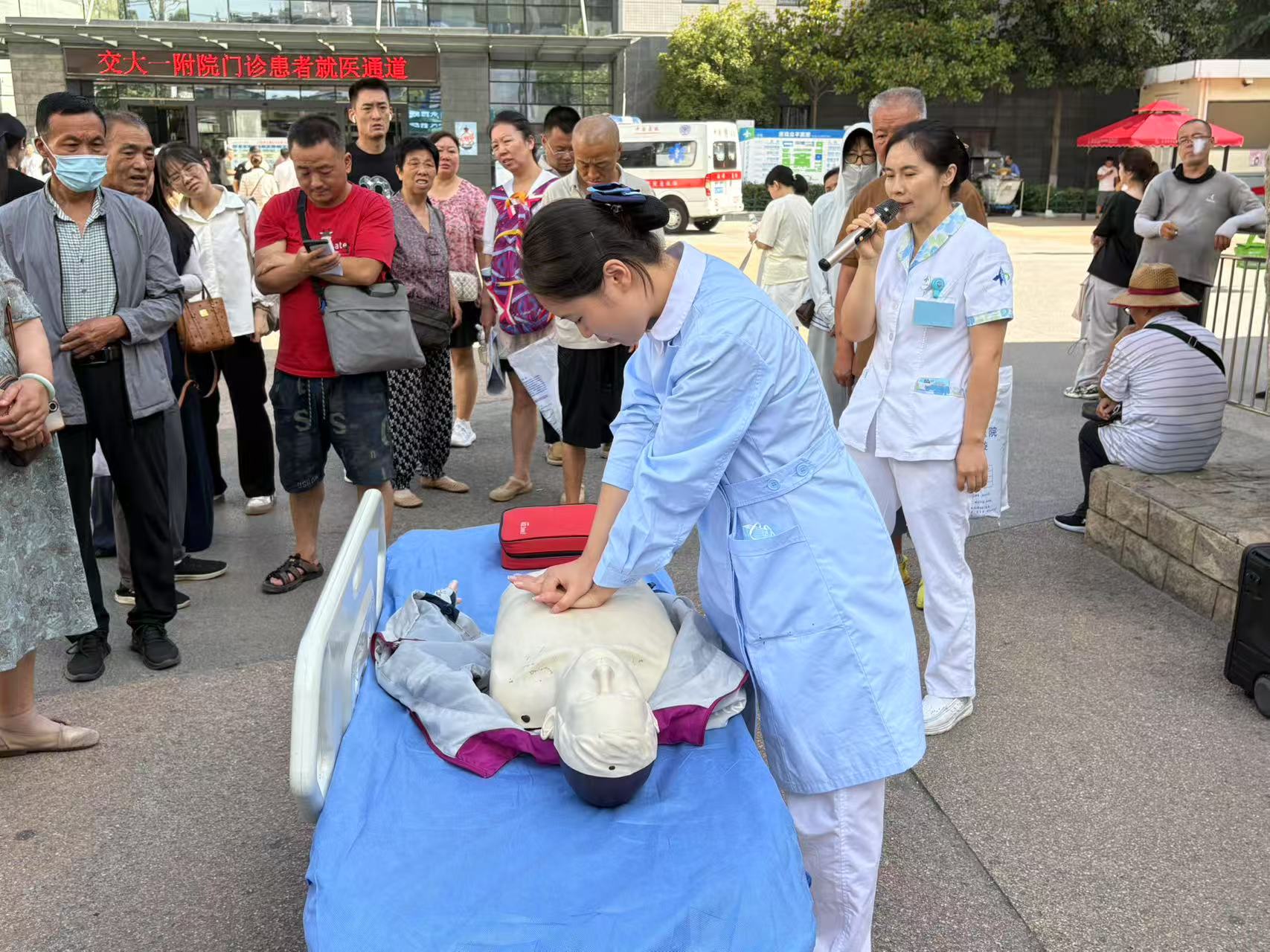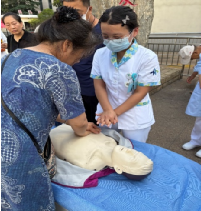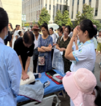 宣讲现场气氛热烈。尽管天气炎热,但医护人员热情不减,讲解深入浅出,语言通俗易懂。他们不仅进行标准示范,更鼓励并指导现场人们亲身参与模拟操作。实习护士们在老师的指导下,积极协助市民进行练习,纠正动作细节,耐心解答疑问。许多路过的市民、等待的患者家属等纷纷驻足观看,并踊跃上前尝试。这种“理论+实操”的模式,极大地提升了学习的效率和参与者的积极性。