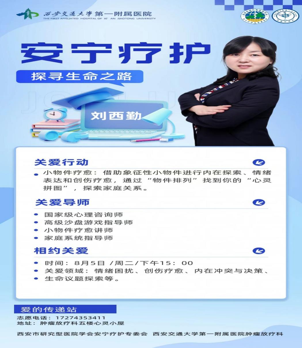 2025年8月5号,在西安交通大学第一附属医院肿瘤放疗科一场特殊的"心灵放疗"正悄然进行。在西安研究型医院学会安宁疗护专委会(以下简称“专委会”)的持续关怀与专业引领下,特别邀请到心理咨询师刘西勤老师引导患者、家属、实习生通过小物件探索内心世界。刘西勤老师有着丰富心理团体带领经验的她让小物件成为照进心灵裂缝的微光,与物理治疗共同诠释"身心同治"的现代医疗真谛