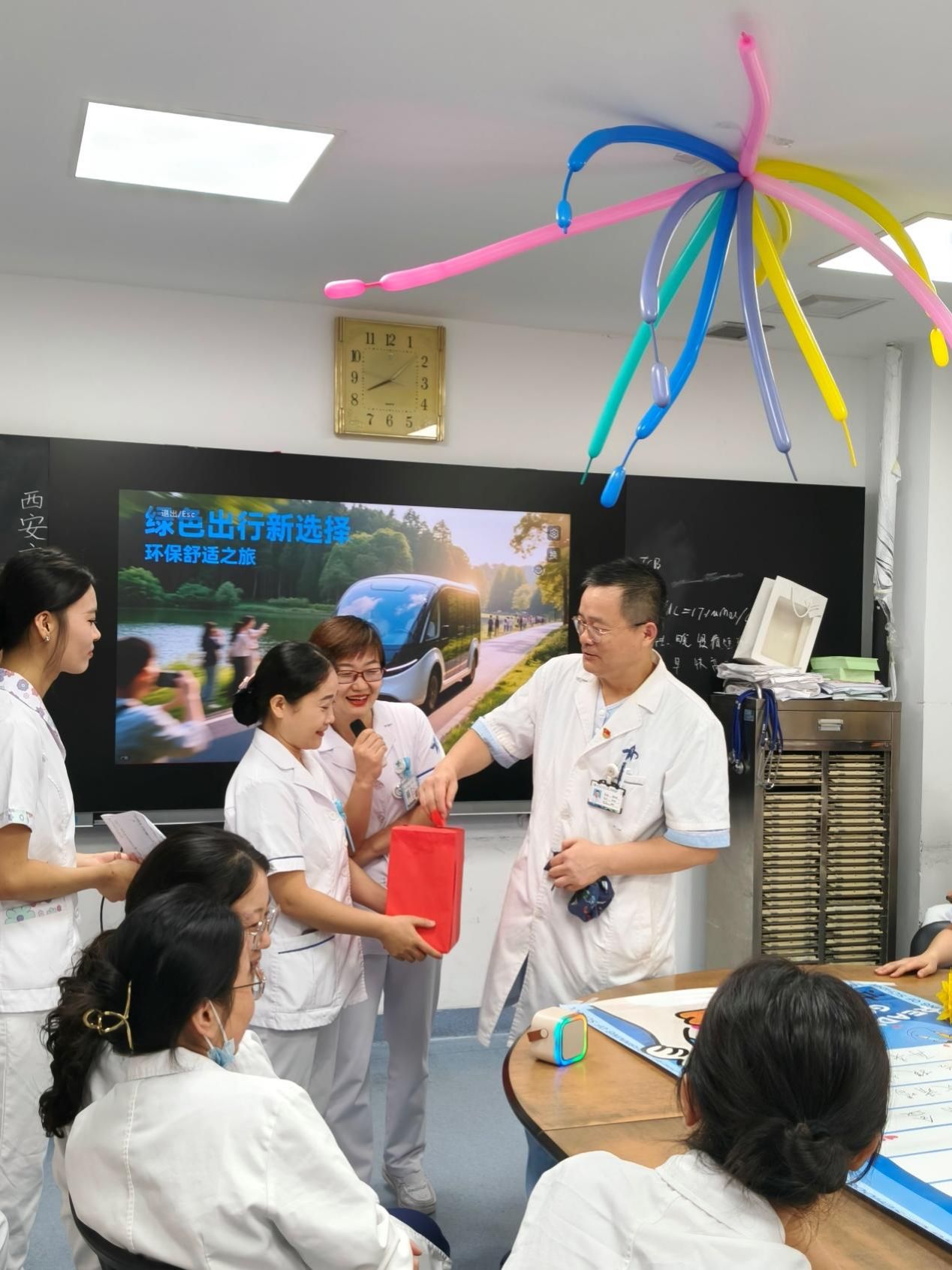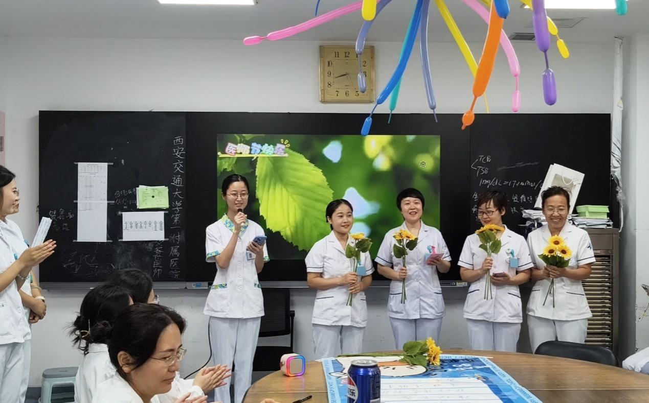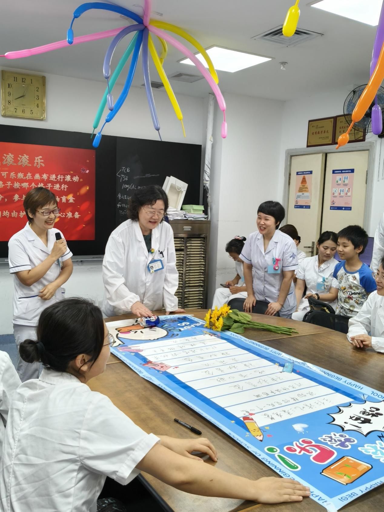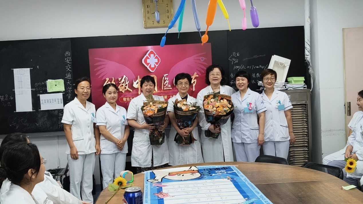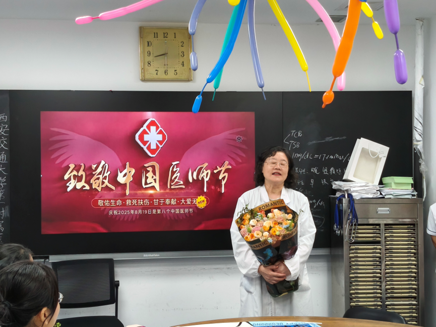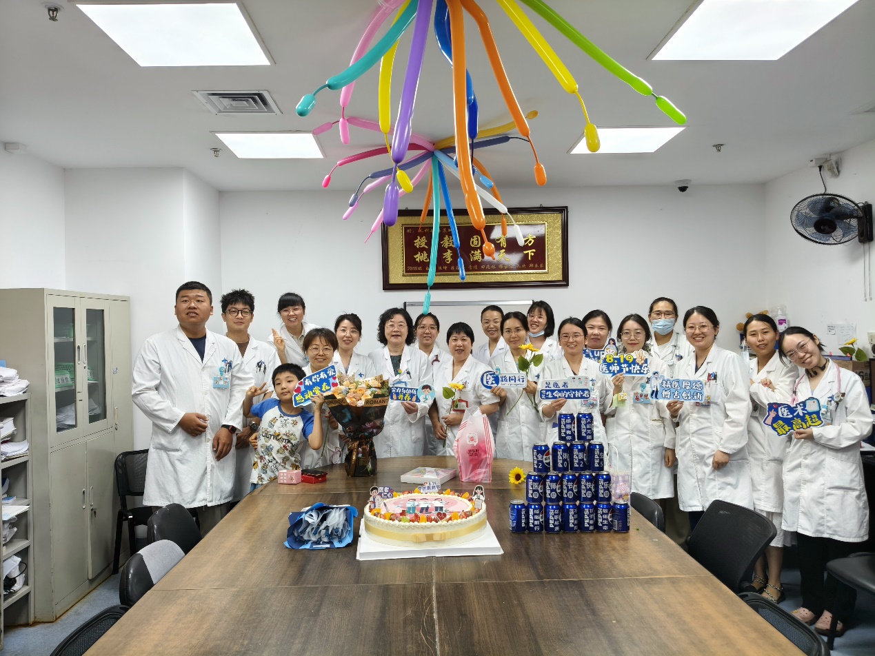 医生办公室被勤劳的护士姐妹们提前布置的极具节日气息。随着莫文蔚独特的嗓音,一首《这世界那么多人》悄然响起,一起带着“医师节快乐”的超大块精美蛋糕映入眼帘。儿内科护士长房夏玲、副护士长陈宁,新生儿科副护士长段旭峰、副护士长史芳芳纷纷手捧鲜花,慰问我科长期奋战在临床一线的医生同志们,并向我科学科带头人刘小红教授、儿科主任周熙慧教授、血液组专家廉国利教授献花,活动场气氛热烈而欢快。