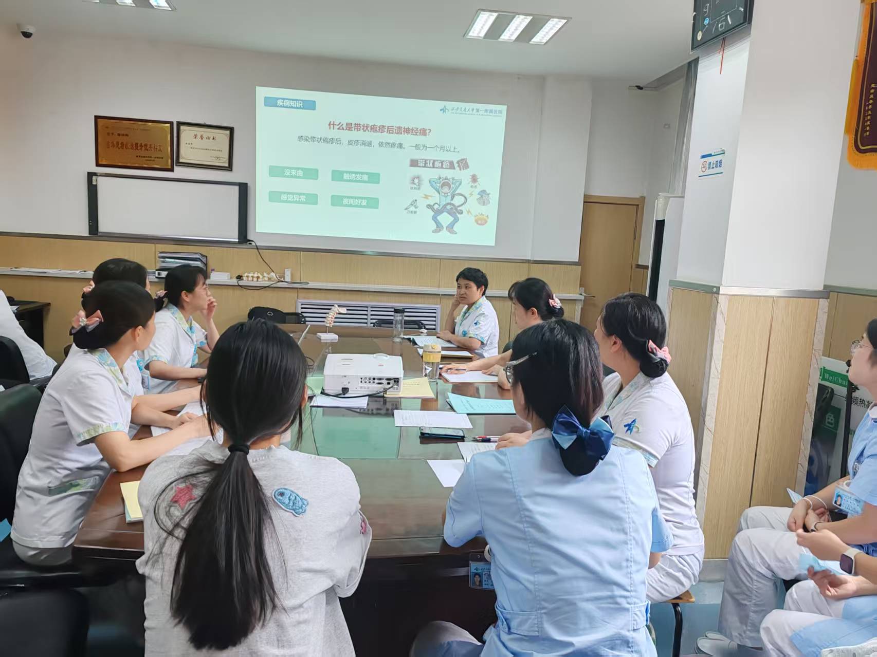 本次查房由刘宵莹护理师主讲,查房聚焦一例84岁带状疱疹后神经痛(PHN)合并肺部感染的患者。刘护士围绕“概念—治疗—护理”三位一体框架展开汇报:从PHN、肺部感染的病因、诊治到个体化重点护理措施的实施;从护理查体到护理计划;从用药护理到围手术期管理;从肺康复的落实到专科健康教育的实施等方面均进行了详细的阐述。随后以时间轴为脉络,完整复盘患者的诊疗护理全流程,深入剖析护理过程中的重点环节,同时提出临床工作中存在的不足并展开现场讨论,最终达到优化完善专科护理流程,提升专科护理质量的目的。