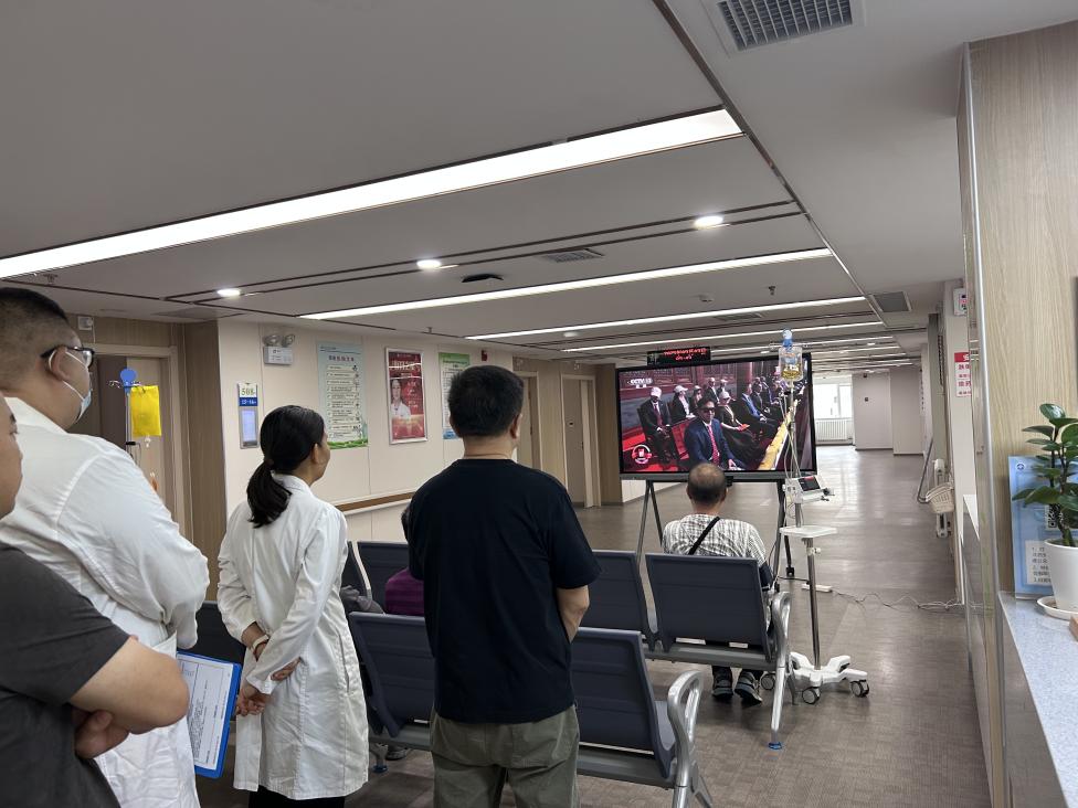 为了让住院患者和家属能够共同见证这一历史时刻,全科医学科的护士们早早地就开始准备,调试好电视机,安排好座椅,确保每一位有意愿观看的患者都能有一个合适的位置。上午9时许,病房走廊里已经聚集了不少患者和家属,大家的脸上都带着期待的神情。当阅兵仪式正式开始,雄壮的国歌声响起,所有人都自发地站立起来,向国旗行注目礼,神情庄重而严肃。