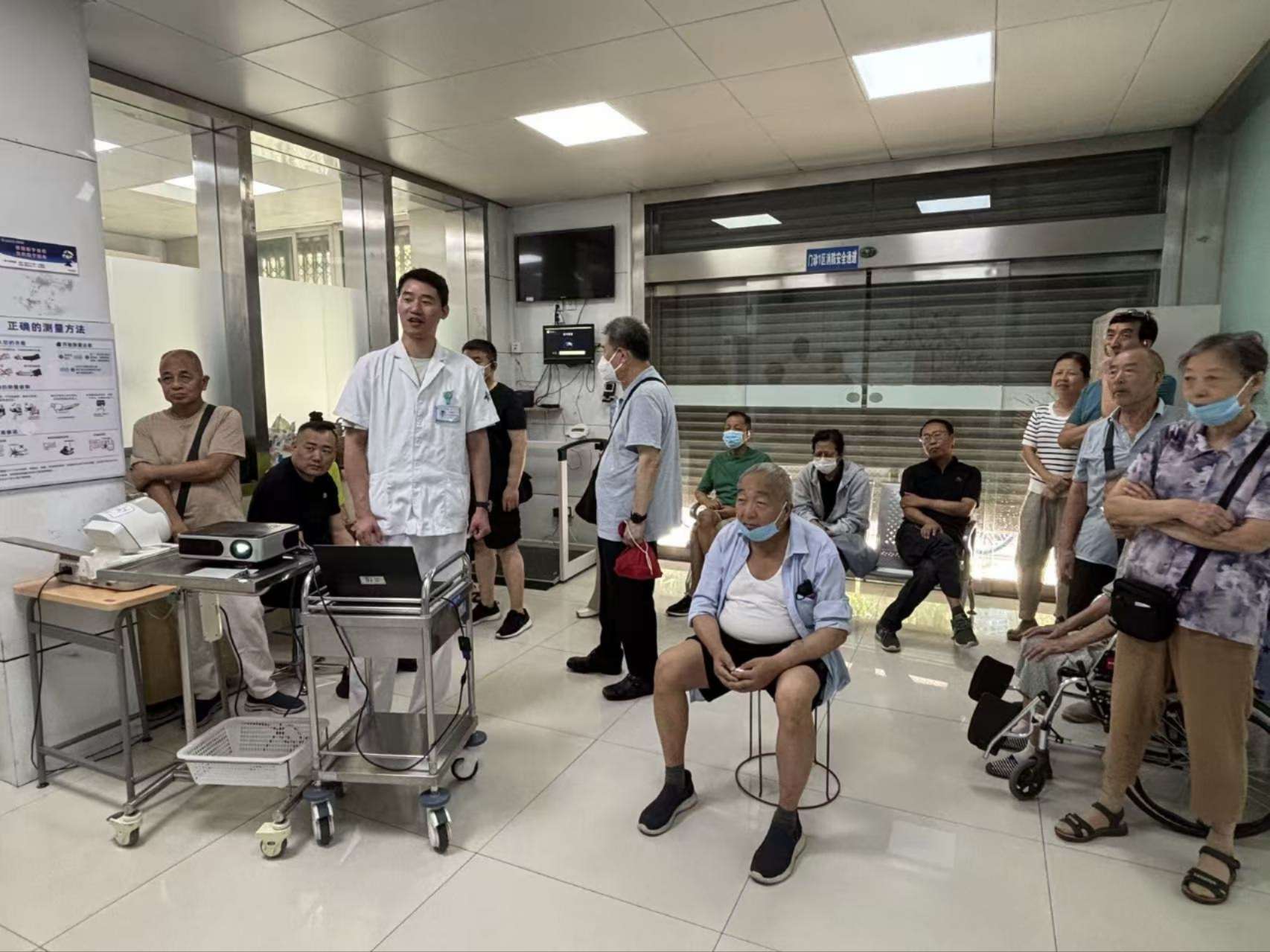 为了更好的普惠到每一位患者,健康教育分了两场进行,首先于8月27日中午时分,利用患者的治疗间隙,宣教活动于门诊透析室准时开始。首先,主管护士张继侦以《守护你的生命线——内瘘 B 超检查知多少?定期检查很重要》为题,进行了深入浅出的讲解。张护士从动静脉内瘘的工作原理讲起,详细阐述了B超检查在内瘘评估中的关键作用,如如何通过B超监测内瘘血流量、管腔直径、有无狭窄或血栓等。他强调:“内瘘的维护‘防大于治’,定期的B超检查就像为我们‘生命线’做的一次精密‘年检’,能及时发现潜在问题,避免内瘘失功等严重后果。”讲解内容图文并茂,实用性强,消除了许多患者对检查的疑虑。
