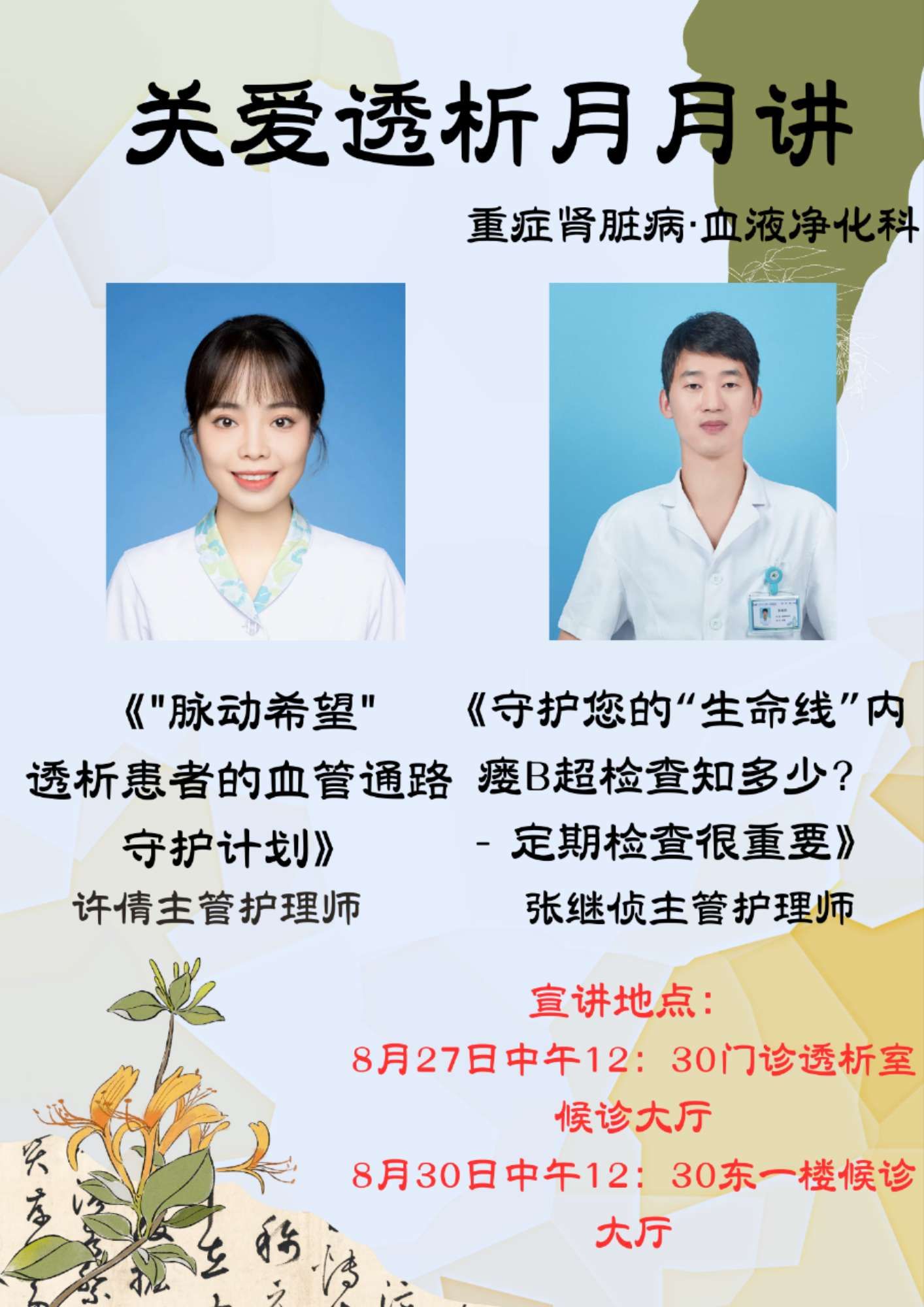 为持续提升透析患者及家属对疾病管理的认知,守护好透析患者的“生命线”,西安交通大学第一附属医院重症肾脏病·血液净化科于2025年8月下旬,分别在门诊透析室和东一楼一楼透析室的候诊大厅,成功举办了两场以“血管通路守护”为核心主题的“关爱透析月月讲”健康教育活动。本次活动由我科主管护师张继侦与许倩共同主讲,吸引了众多在院治疗的患者及家属驻足聆听,现场互动热烈,反响良好。