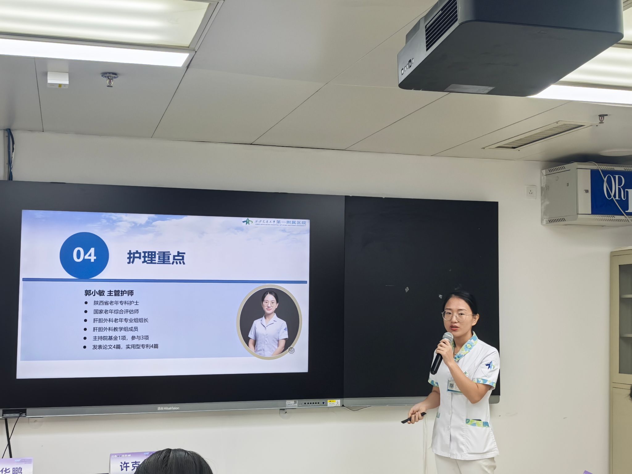 随后,田文杰主管护理师开展“病历介绍、护理重点”的讲解,详细介绍相关病例情况以及护理工作的重点所在。郭小敏主管护师则进一步聚焦“护理重点”,深入剖析护理过程中的关键要点与实施细节。