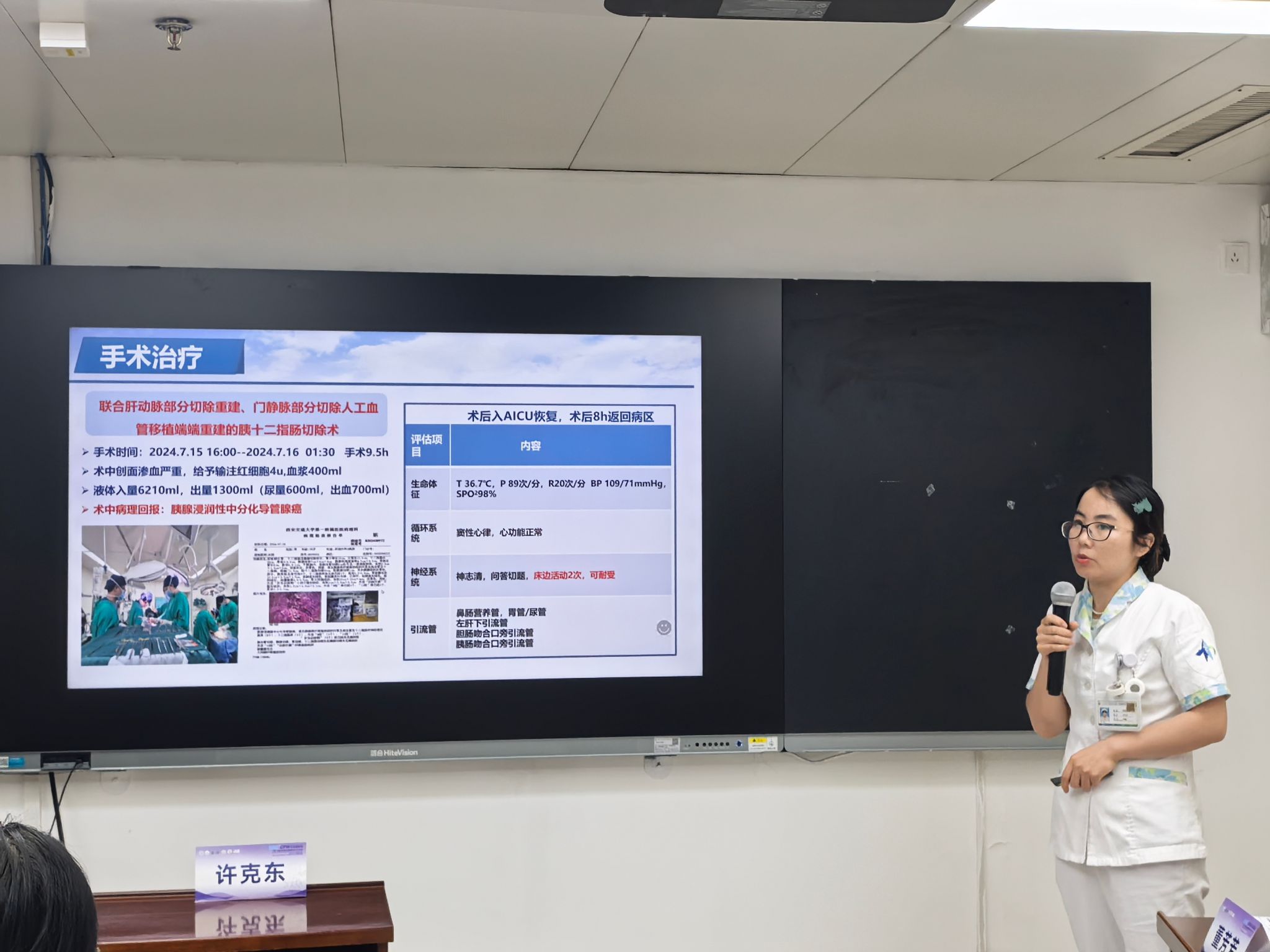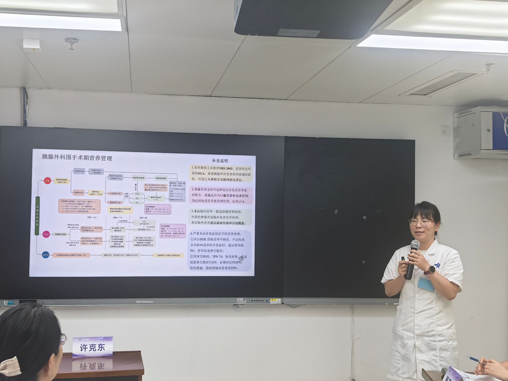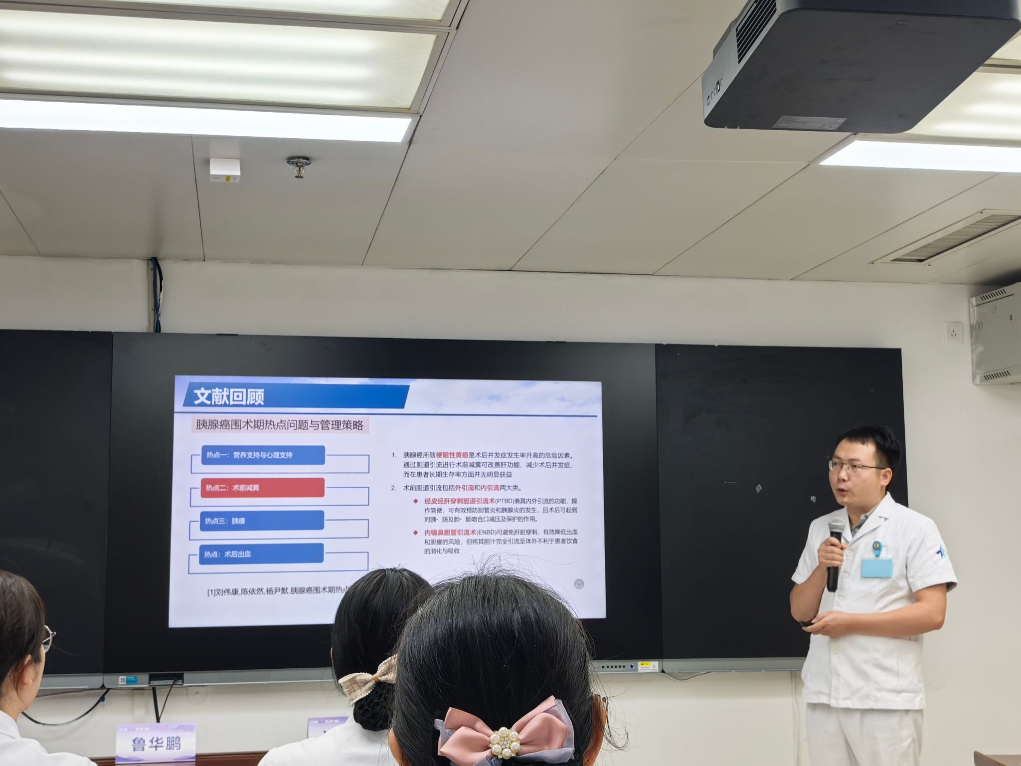 会议伊始,许克东主治医师带来“胰腺癌诊疗进展”的分享,为大家梳理胰腺癌诊疗领域的前沿动态与发展方向,让与会者对该疾病的诊疗有了更全面的认识。接着,鲁华鹏主管护理师进行“胰腺癌护理相关文献回顾”,总结过往胰腺癌护理的研究成果与经验,为后续护理工作提供了理论参考。