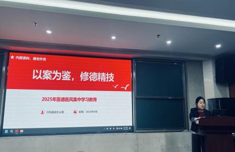 科室党员吴沛同志以《以案为鉴,修德精技——2025年医德医风教育》为题,系统阐述了集中整治医德医风的重要意义。她结合中央、陕西省委相关整治工作要求,从政治要求(党性试金石)、行业发展(生存发展生命线)、群众利益(服务晴雨表)三重维度,阐明整治工作的紧迫性,并明确了“坚定政治方向、党风引领行风”等七大类整治重点及具体举措。随后,吴沛同志重点围绕国家卫生健康委等四部门联合印发的《医务人员职业道德准则(2025年版)》,讲述了文件出台背景、适用范围及“明大德、遵医德、守公德、严私德”的核心要义,并逐条讲解“坚定政治方向、爱国遵纪守法”等十项具体准则,引导全员对标践行。