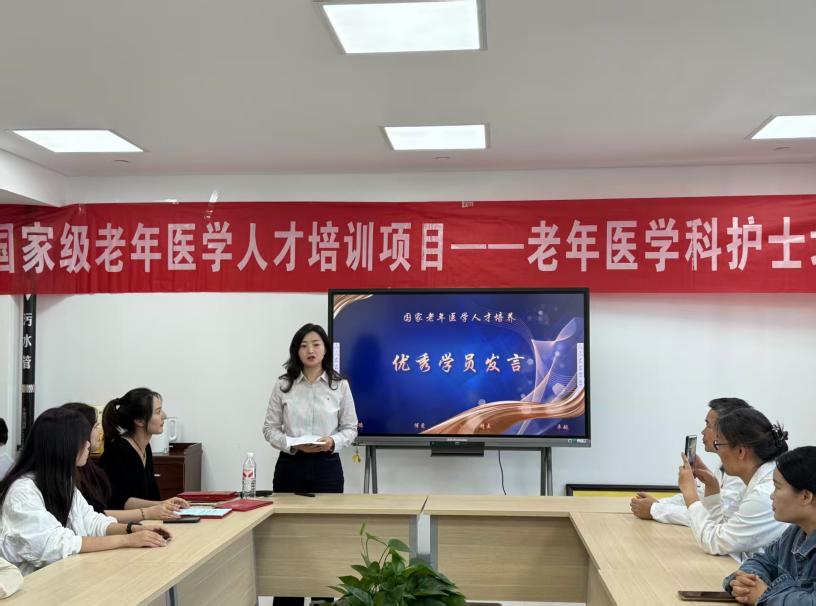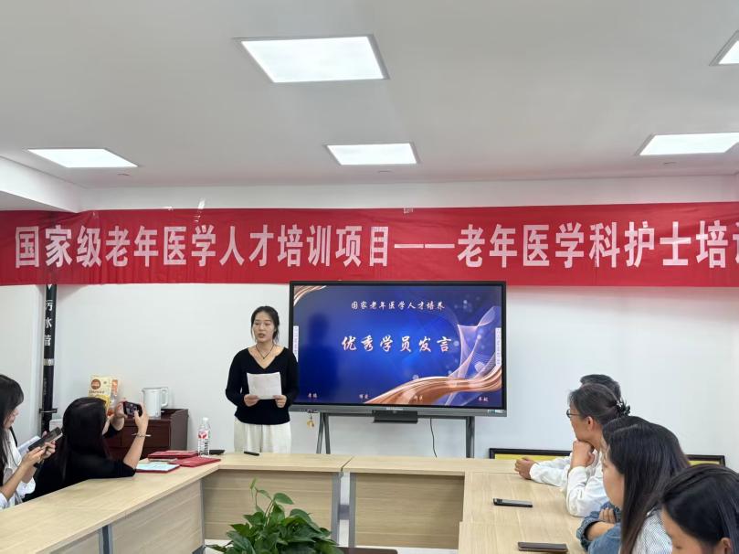 汉中市中医医院刘欢发言。她首先对各位领导、老师致以最崇高的敬意和最衷心的感谢,其次,总结了她本次培训班系统学习的老年护理基础理论知识和基本实践技能,最后,她会将所学技能带回工作单位,为老年患者筑起健康的“长城”。