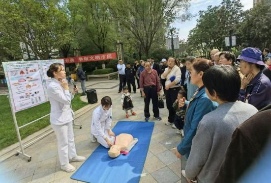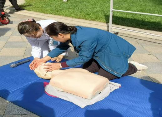 心肺复苏操作演示同样也是活动现场的一大亮点。苗小宁护士和侯慧护士详细演示了心肺复苏操作流程,并邀请现场居民模拟练习并纠正动作。不少居民在指导下亲自上手学习,掌握了基本的急救技能。