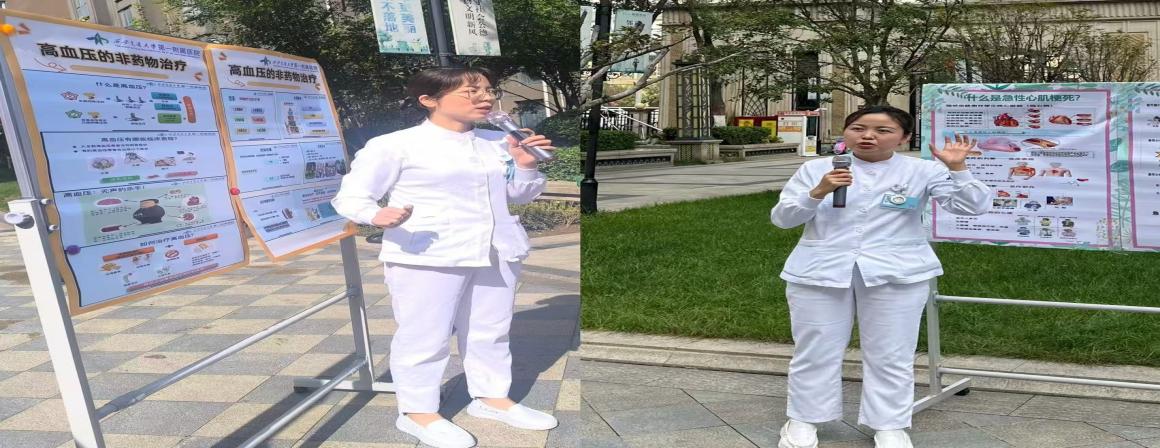 同时,健康科普宣讲师苗小宁和侯慧两位护士分别开设了高血压居家护理和急性心肌梗死家庭自救的小课堂。用最通俗易懂的语言,将专业的医学知识转化为社区居民看得懂、学得会、用得上的生命急救技能。这些凝聚着护理工作者智慧与温度的展架,成为义诊现场另一道亮丽的风景线,让健康科普真正“立”起来、“活”起来。