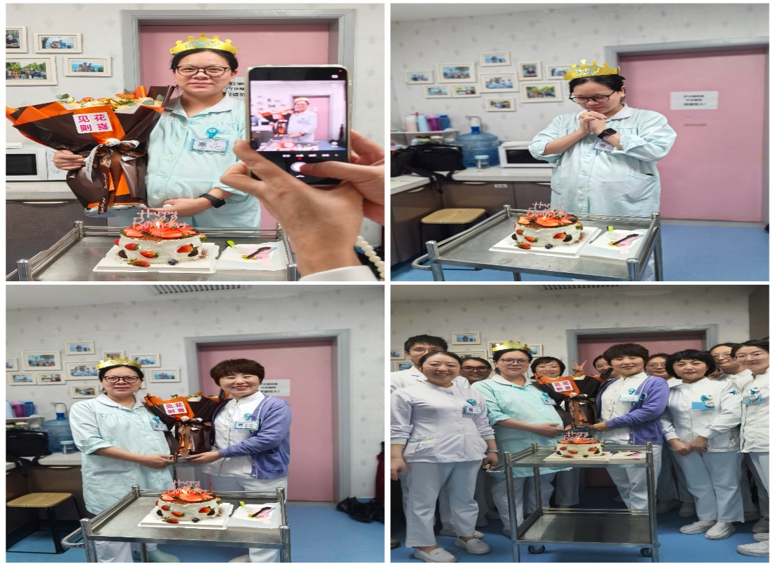 得知科室里陈扬老师的生日与休产假时间相近,科室的护士们便悄悄策划起了这场特别的生日会。大家利用休息时间,自发准备了生日蛋糕和鲜花。当陈扬老师看到蛋糕和鲜花时,脸上瞬间绽放出惊喜与感动的笑容。护士长李静老师首先代表全体护士人员送上诚挚的生日祝福,她亲切地说道:“在这个特殊的时刻,我们不仅要迎接新生命的到来,也要为你送上最美好的生日祝愿。希望你在休产假期间好好调养身体,期待你带着可爱的宝宝早日回到我们这个大家庭。”随后护士们纷纷围上前来,为准妈妈送上鲜花和蛋糕。在温馨的氛围中,准妈妈闭上眼睛,许下了美好的心愿,然后与大家一起吹灭了生日蜡烛。那一刻,幸福的笑容在她的脸上绽放,仿佛所有的疲惫和不适都烟消云散。面对科室护士们的深情厚谊,准妈妈感动得热泪盈眶。她激动地说:“在这个特殊的时期,能得到科室这么多的关心和祝福,我真的特别感动,在这个大家庭体会到了家一般的温暖”。