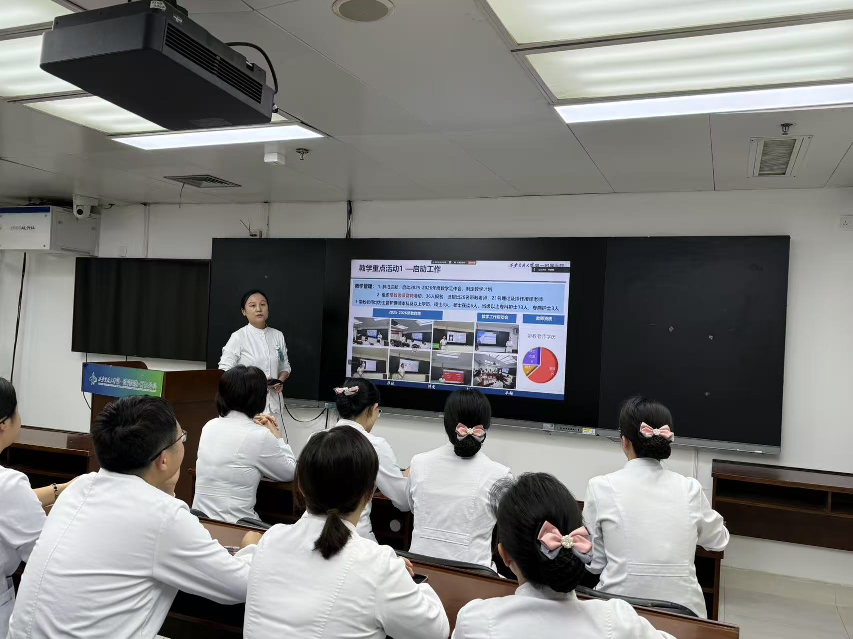会议伊始,总带教郑倩倩就现阶段的教学工作进行了系统梳理与汇报。本学期教学工作重点明确,计划执行到位,严格围绕《肝胆外科护理教学大纲》展开,重点聚焦于专科理论知识巩固、核心技能规范化培训以及护患沟通与人文关怀能力的培养。教学计划得到了有效执行,各项培训与考核均按节点完成。亮点工作突出,教学成效显著,“一对一”导师制持续深化,带教老师全程负责,不仅在技术上“传帮带”,更在职业认同和心理调适上给予关怀,帮助学生快速融入科室文化。