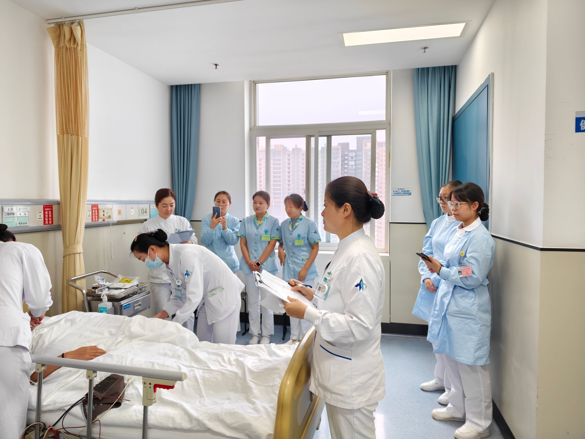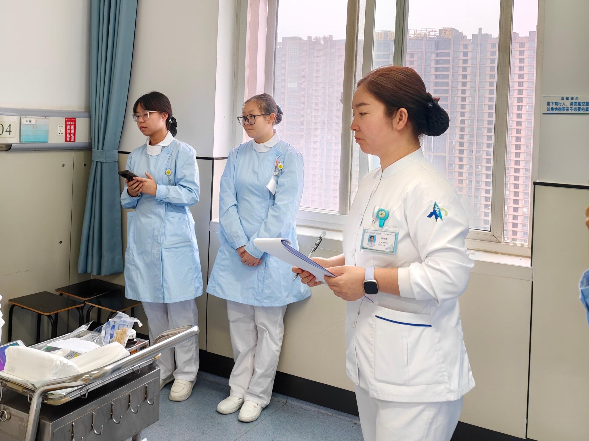作为本次竞赛的拍照和观摩者,我深受震撼与启迪。在镜头下,我好像不只是旁观者,而是与老师们一同呼吸、一同紧张、一同沉浸于这场竞赛中。在操作开始后,每一位老师都全神贯注并且动作流畅,从每一个细节中,都展现出了专业素养和职业风采,让我真切体会到什么叫作“精益求精”!让我受益匪浅的是赛后点评环节,王沙沙老师一针见血地指出操作中容易忽略的细节,例如调节心电监护的阈值、血压如何正确测量等;朗澜老师说,健康宣教不是我们说了多少,而是患者听懂了多少,能做到多少;白护士长强调,人文关怀是护士职业的灵魂所在,再娴熟规范的操作,如果缺乏共情与关怀,便只是冰冷地执行流程,而沟通的本质恰恰是理解与共情的传递。竞赛结束后,我的心久久不能平静,我突然意识到,我记录的不仅仅是比赛,更是一堂深刻的职业启蒙课,它让我看到了一名优秀护士应有的样子,也让我更加坚定要脚踏实地地努力成长为一名值得信赖的护理工作者!