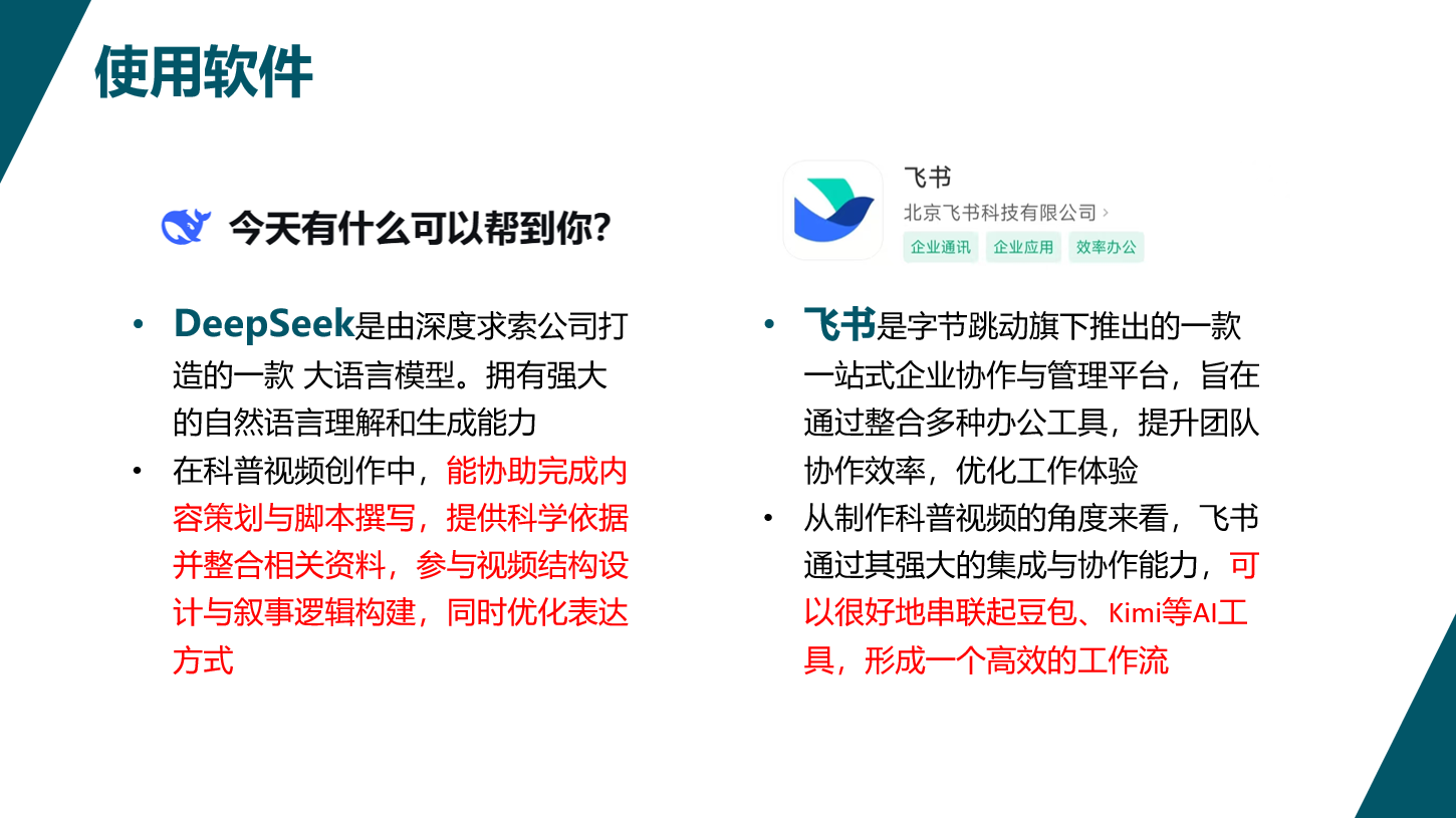 王博士首先介绍了AI视频制作的工作流构建,介绍了使用AI工具(如DeepSeek),可以实时追踪网络热点话题,分析公众兴趣点,协助我们智能选题,完成内容策划与脚本撰写。并能够结合权威文献自动生成通俗易懂的初稿,大幅减少药师们人工调研的时间,提升工作效率。其次,利用AI语言模型(如Claude、文心一言),将晦涩难懂的专业论文一键转换为青少年、老年人等不同群体可理解的不同版本。利用DeepL Write等工具实现辅助校对,避免知识性错误,确保科普文章的全面性和科学性。最后,通过多媒体创作,告别“专业壁垒”,利用豆包、剪映等绘图工具和视频制作工具,生成所需的图形、多语种字幕,最终合成视频。