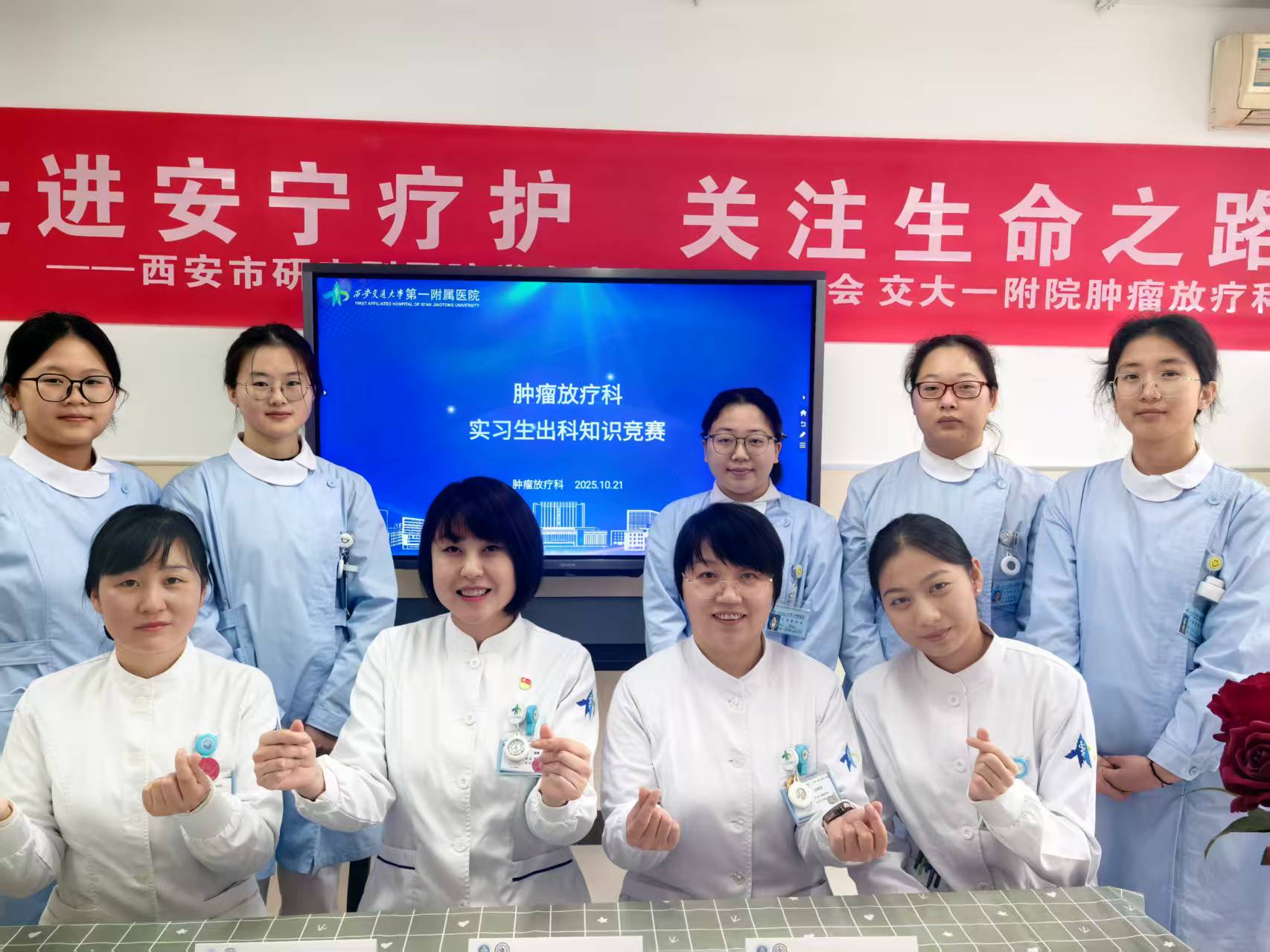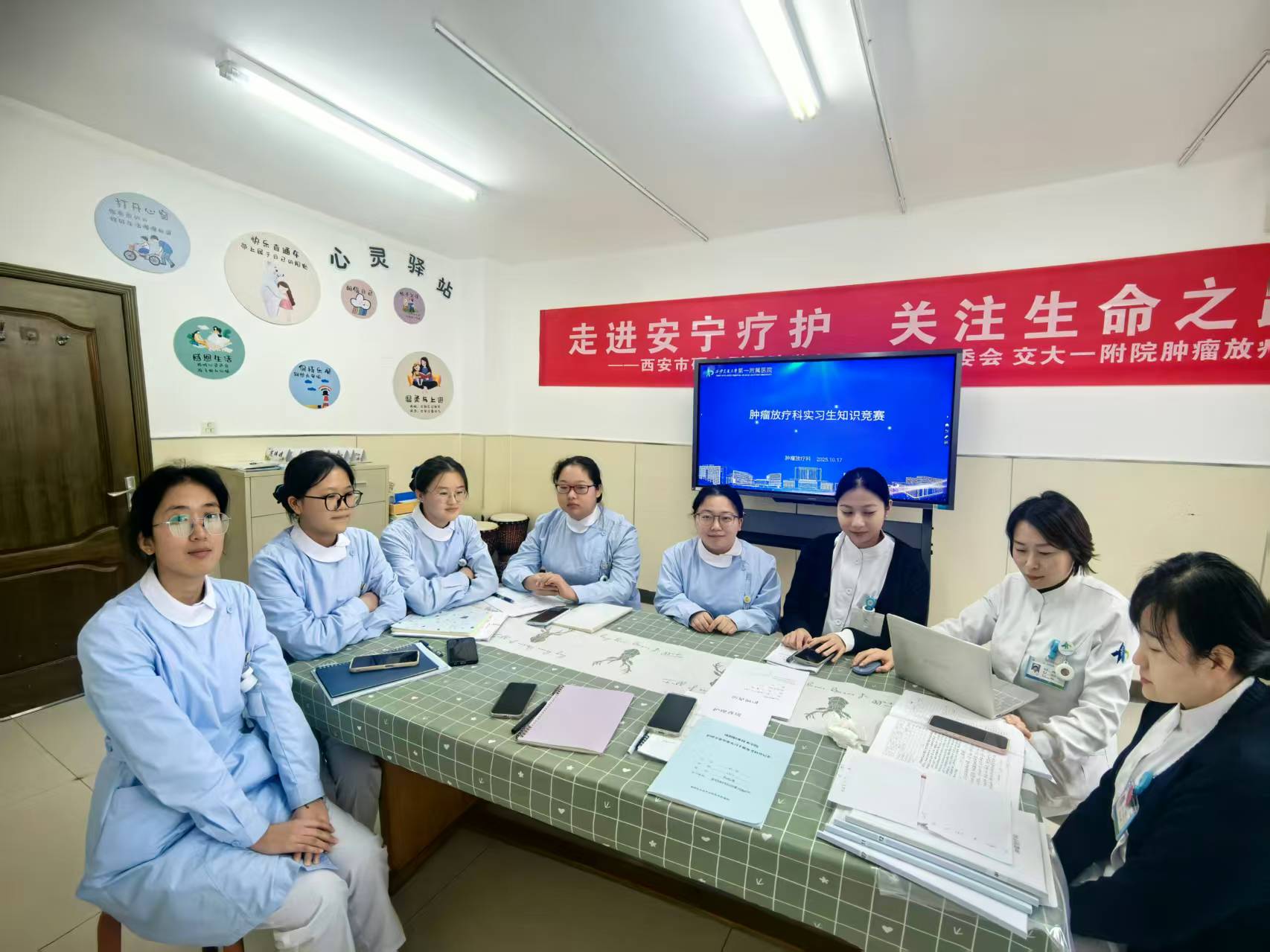 10月21日,肿瘤放疗科五楼会议室内洋溢着温暖的氛围,一场别具一格的理论知识竞赛在此精彩上演。护士长李茸、刘东阳,以及总带教徐小青、带教组长豆翠萍、王玲悉数出席,与五位实习生及规培生刘喆一同度过了这段温馨且充实的时光。