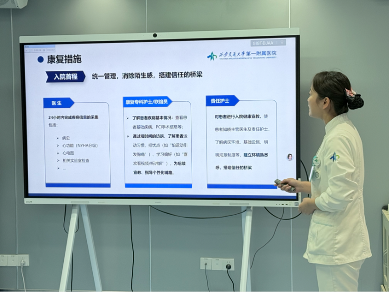 心内CCU病区为赋能“心”健康,结合病区情况,将急性心肌梗死PCI术后患者早期运动康复的规范实施作为“一科一品”。筹备阶段,全科室护理人员进行康复相关培训、考核及医护联合康复知识竞赛,提高全员康复技能水平;科室提供设备支持,为两院区均配备了康复器材。康复阶段更是从入院开始筛选适宜运动康复的患者,通过视频+讲解的方式进行宣教,让患者“主动愿意”参与康复,直至患者出院后仍会随访监督,让患者“不偷懒”,改善患者的心肺耐力与肌肉功能,并在心理层面有效缓解其运动恐惧。