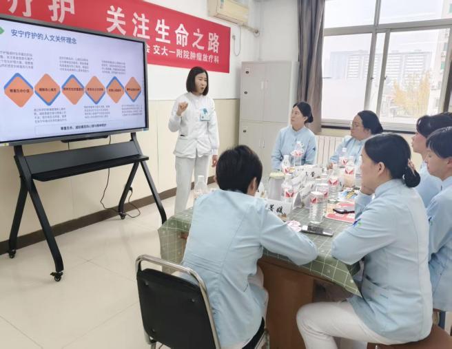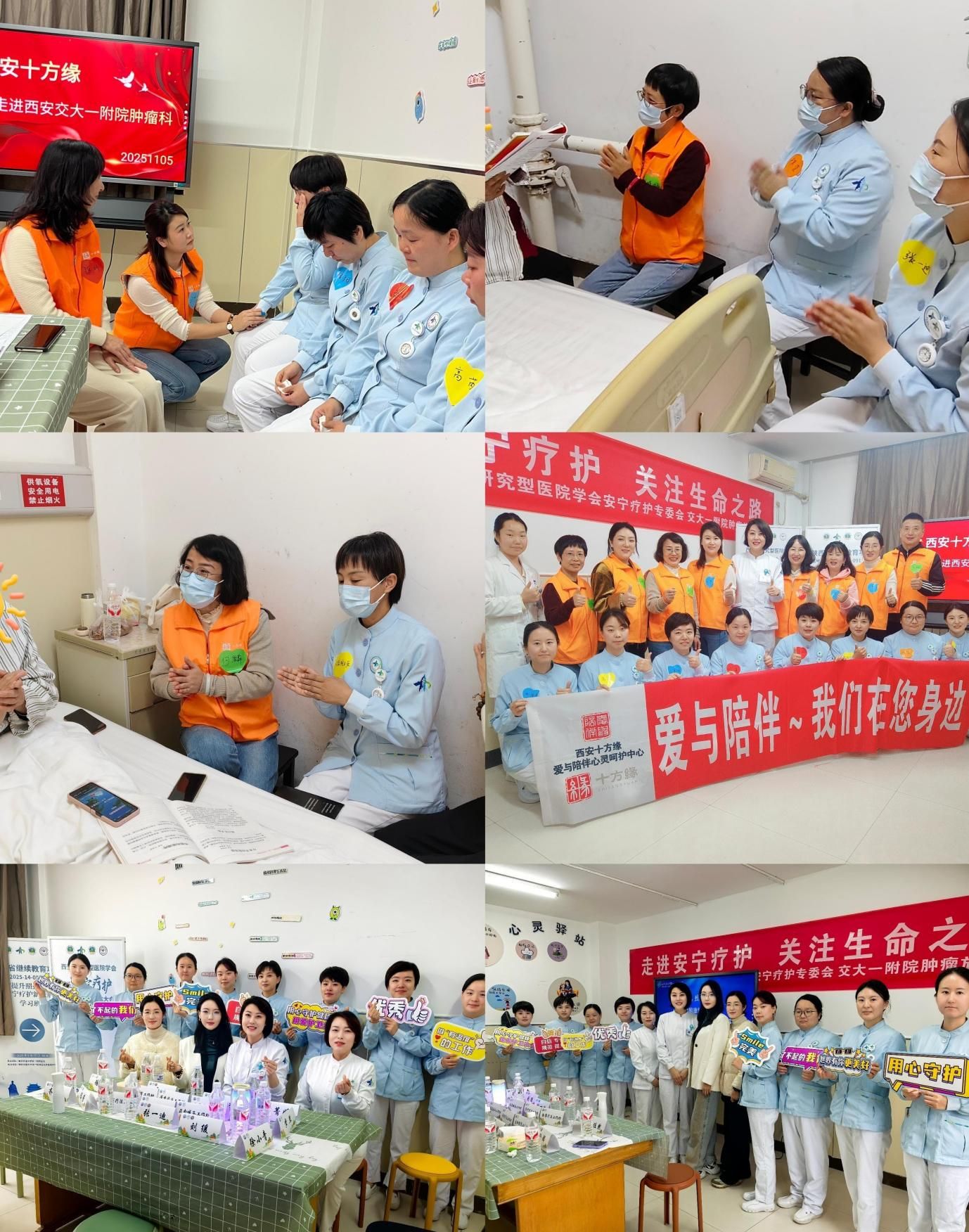 在西安十方缘爱与陪伴心灵呵护中心的协作下,护士们走进病房开展深度陪伴服务。从一对一的心灵沟通到团体式的情感支持,她们用耐心与共情驱散老年患者治疗中的孤独与恐惧,让“爱与陪伴,我们在您身边”从口号转化为实实在在的护理行动,生动诠释了安宁疗护“关注生命之路”的核心理念。