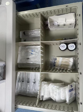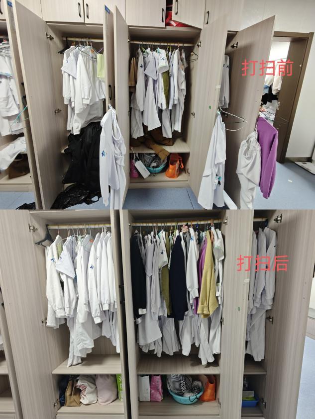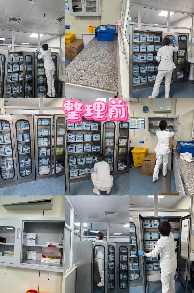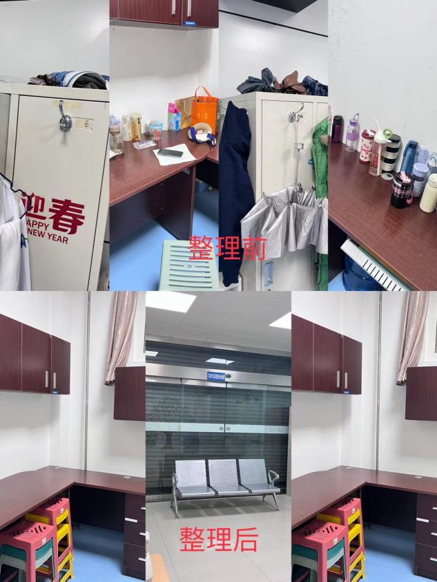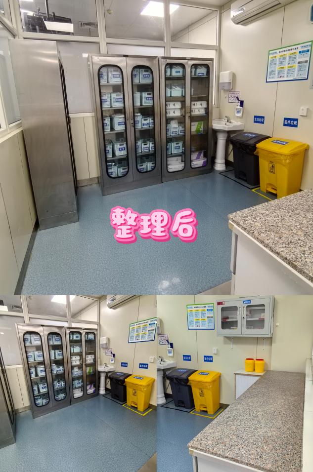 在薛小红副护士长的带领下,全体医护人员以饱满的热情投入到整改工作中。大家从“整理”入手,对各个角落进行了彻底清查,清除了非必需品,为工作空间“减负”。随后是精心的“整顿”,依据使用频率和流程,对药品、器械、耗材等进行分类、定位和标识。例如,治疗室内的注射器、棉签等均按标识入柜,一目了然;处置室严格区分清洁与污染区域,拖把、抹布定点悬挂;负一楼更衣室、休息室也实现了物品的定置管理,被褥整齐,线路规整,面貌焕然一新。