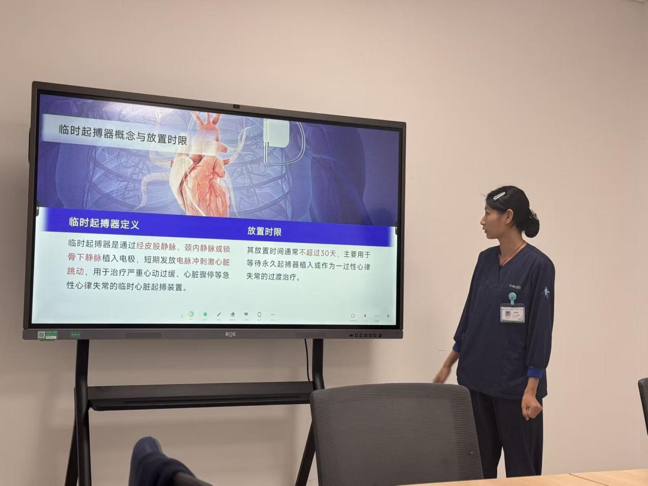 培训由CCU护士戴嘉怡担任主讲。她首先从理论基础入手,清晰地阐述了临时起搏器的定义:“临时心脏起搏是一种短期的生命支持技术,它通过经静脉、心外膜或经胸壁等途径,将起搏电极置于心脏,连接体外脉冲发生器,针对因各种原因导致的心动过缓或传导阻滞,发放特定节律的电脉冲,以激发心肌收缩,从而维持患者有效的血液循环,为治疗原发病赢得宝贵时间。”徐战磊护士长强调,临时起搏器是抢救阿斯综合征、严重窦性停搏、高危心律失常等患者的“生命桥梁”,其正确使用与精细护理直接关系到患者的转归与安全。聚焦临床,强化实操:精细化护理是成功关键。在明确了定义与适应症后,培训重点进入了临床护理实践环节。戴嘉怡护士结合大量临床案例,系统梳理了临时起搏器护理的核心要点:1. 持续严密的心电监护2. 起搏器系统的安全管理3. 穿刺部位的观察与护理4. 患者的全面评估与教育:用通俗易懂的语言向患者及家属解释注意事项,减轻其焦虑,争取积极配合。