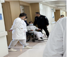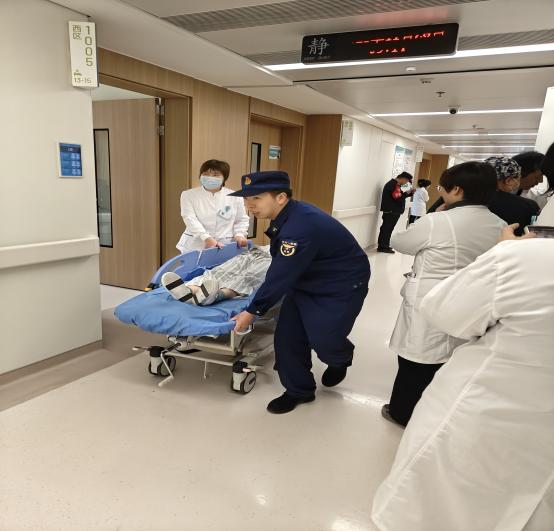 疏散引导组人员闻令而动、迅速就位,遵循“危重患者优先、专人全程护送、低姿弯腰前行”的原则,引导患者及家属用湿毛巾捂住口鼻,沿着疏散标识箭头方向,有序撤离至室外安全区域。对于卧床、行动不便的患者采用轮椅推送、平车转运等方式转移,全程密切兼顾患者病情监测与安全防护,尽显医者担当。通讯联络组同步向医院消防中控室及保卫科报告火情信息,清晰说明起火位置、火势大小及被困人员情况。整个演练过程衔接紧密、反应迅速,各小组分工明确、配合默契,充分展现了神经内科医护人员“临危不乱、科学处置、协同高效”的应急素养与专业风采。