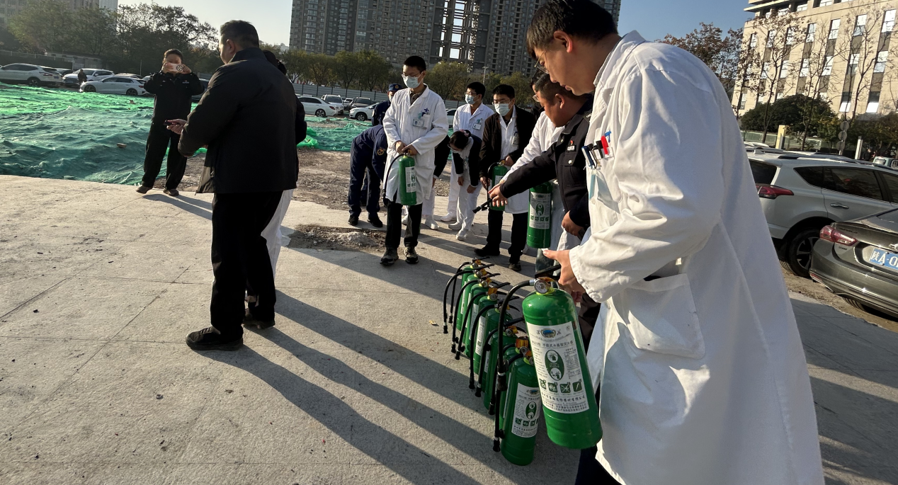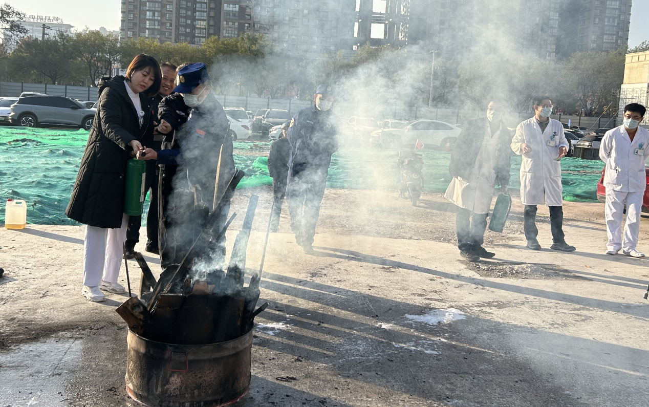 外科大楼负一层演习结束后,放疗科刘锐副主任和李茸护士长带领职工在食堂南侧空地现场实战用水基灭火器扑灭初起火苗。