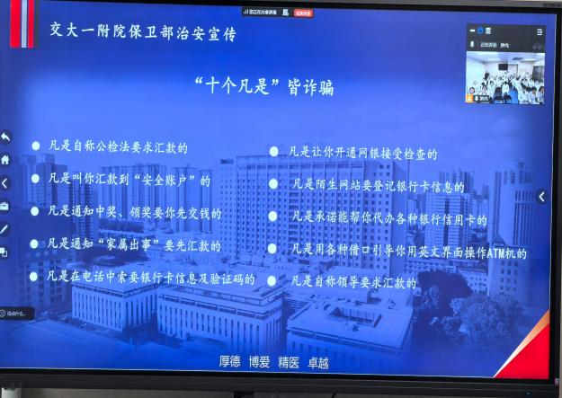 为提升医护人员安全防范意识,筑牢医院安全防线,近日,西安交通大学第一附属医院肿瘤内科联合医院保卫科开展了一场别开生面的防诈骗保安全知识宣教及现场演练活动。