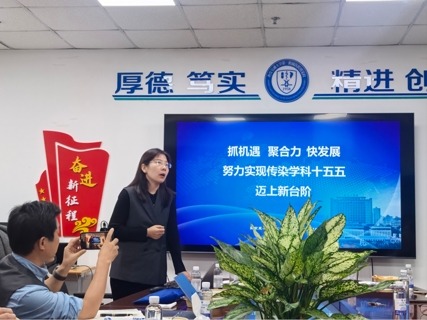 会议开篇,学科办主任马欣以“抓机遇 聚合力 快发展,努力实现传染学科十五五迈上新台阶”为题作指导发言,从医院整体发展战略、陆港院区规划布局、传染学科未来发展路径三个维度,为科室发展精准把脉定向,让在场医护人员明晰了时代机遇与责任使命。