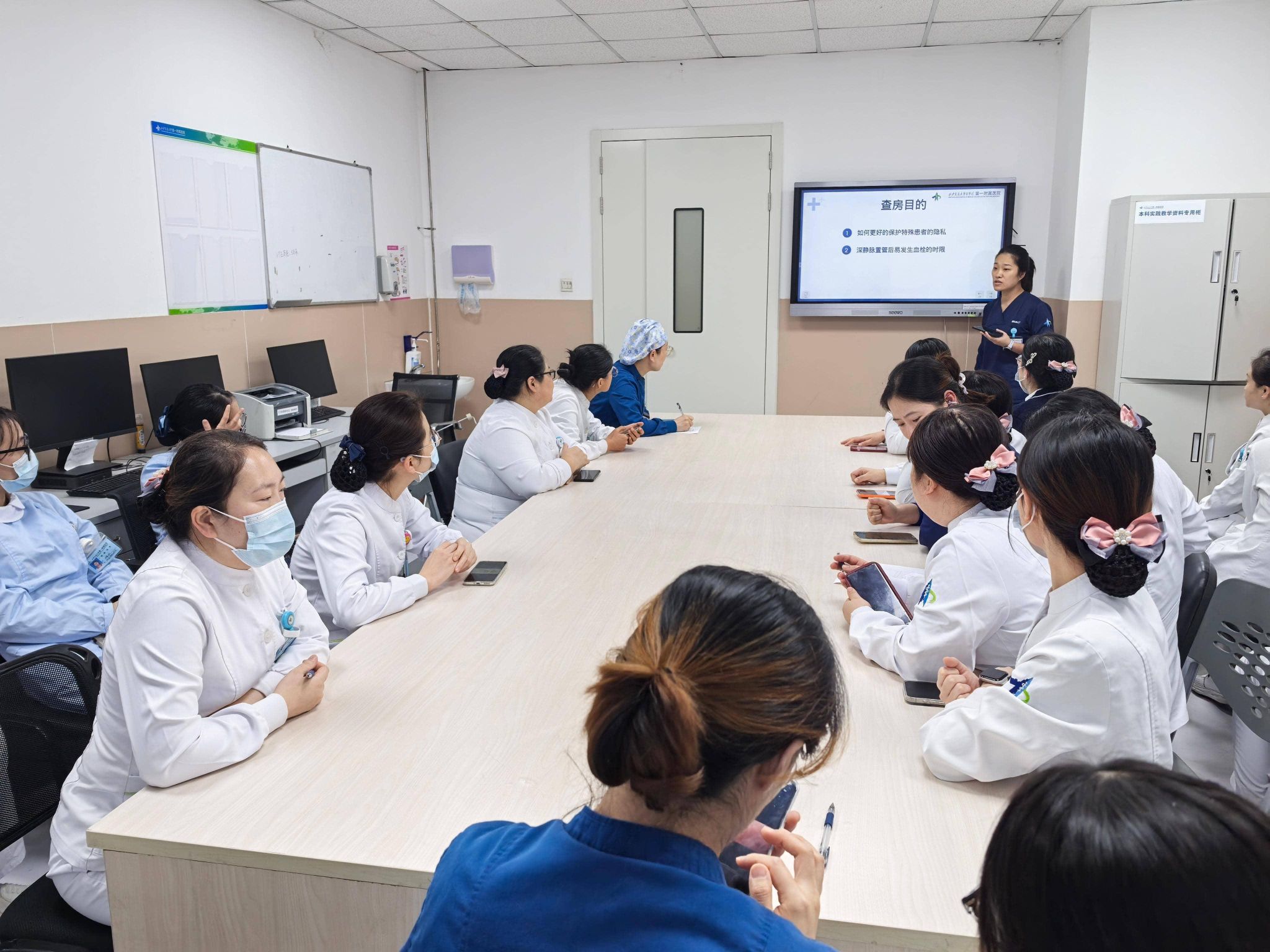 初冬时节,寒潮初袭。为进一步提升护理服务质量,深化专科护理内涵,保障患者安全,我科四个病区全体在岗护士在感染二病区医生办公室成功举行了本月度的护理查房。本次查房由李静护士长主持,全体护士、护理规培生及实习护生共同参与,围绕“一例HIV隐私泄露合并置管后血栓形成”的复杂病例进行了深入的学习与探讨。
