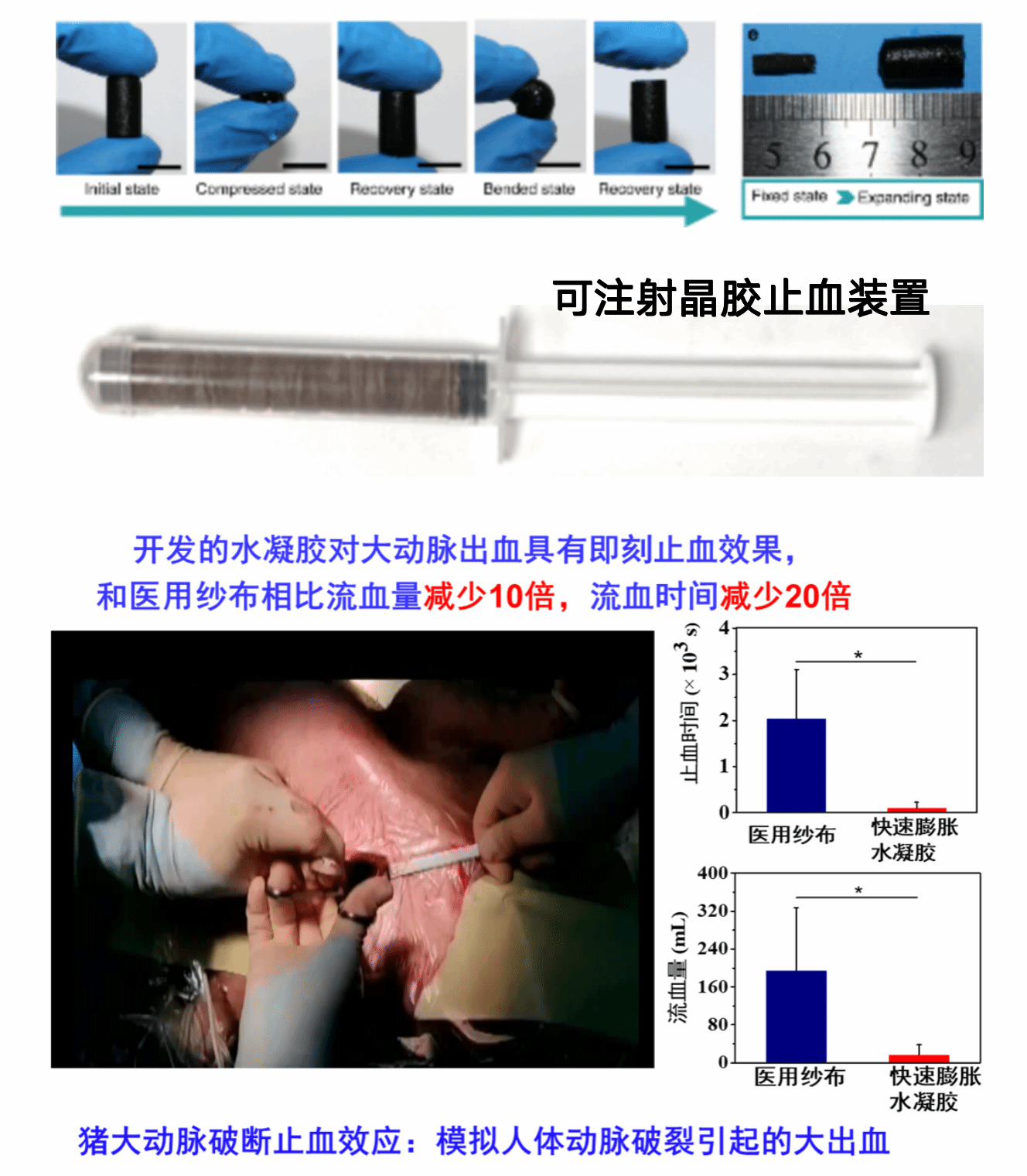 (3)止血材料:在创伤救治关键技术方面,西安交通大学第一附属医院骨科团队自主研发的快速膨胀水凝胶物理封堵止血策略实现重要突破。该技术面向深部、不可按压性创面提出全新解决方案,水凝胶材料可在伤口内部迅速膨胀并形成稳固物理屏障,实现快速止血、显著减少失血量,为战创救治和大出血事故处置提供了高效手段。业内专家评价,该成果有望成为提升极端条件下紧急救治能力的关键技术之一。