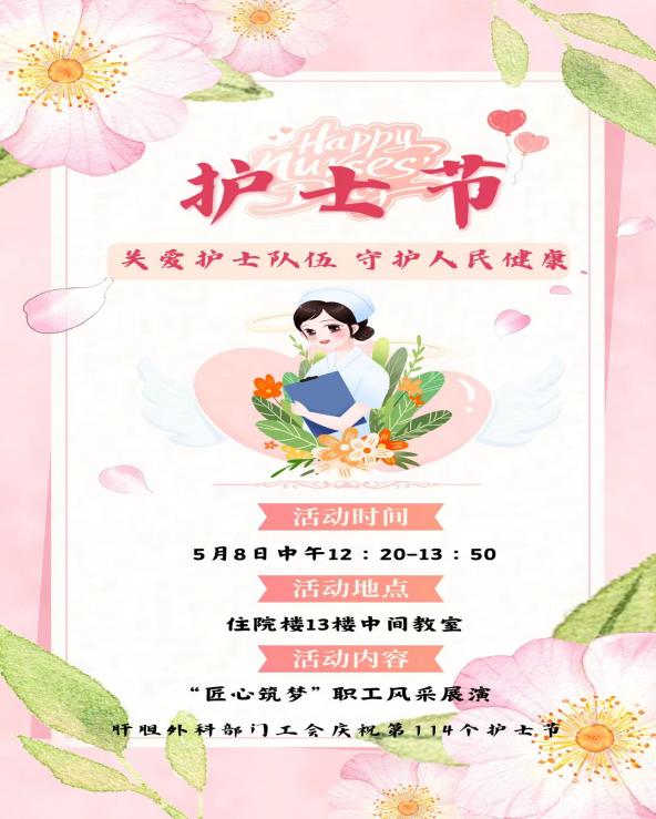 在第114届国际护士节之际,肝胆外科工会部门组织举行了"匠心筑梦"职工风采展演活动,于2025年5月8日中午在住院部13楼中间大教室举办。部门工会孙亚利副主席代表工会给护士姐妹们送上节日的祝福,活动由文化组组员胡洁主持。