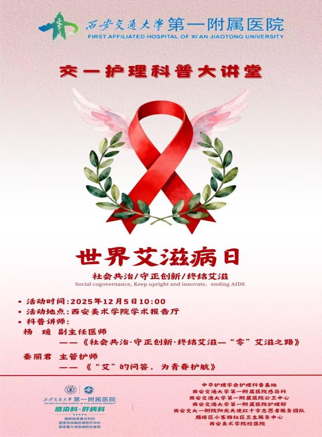 为进一步普及艾滋病防治知识,提升高校青年学生健康素养与自我保护能力,营造校园艾滋病防治良好氛围,继12月1日在陕西商贸学院成功举办“携手防艾,守护青春”主题宣讲后,感染科科普团队再接再厉,于12月5日(星期五)上午,携手我院公共卫生中心、小寨社区卫生服务中心及西安美术学院校医院,在西安美术学院报告厅联合举办以“社会共治,守正创新,终结艾滋”为主题的艾滋病防治科普宣讲活动。