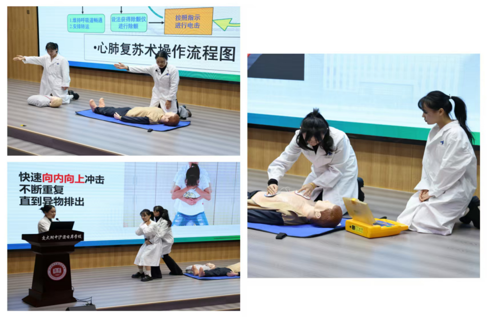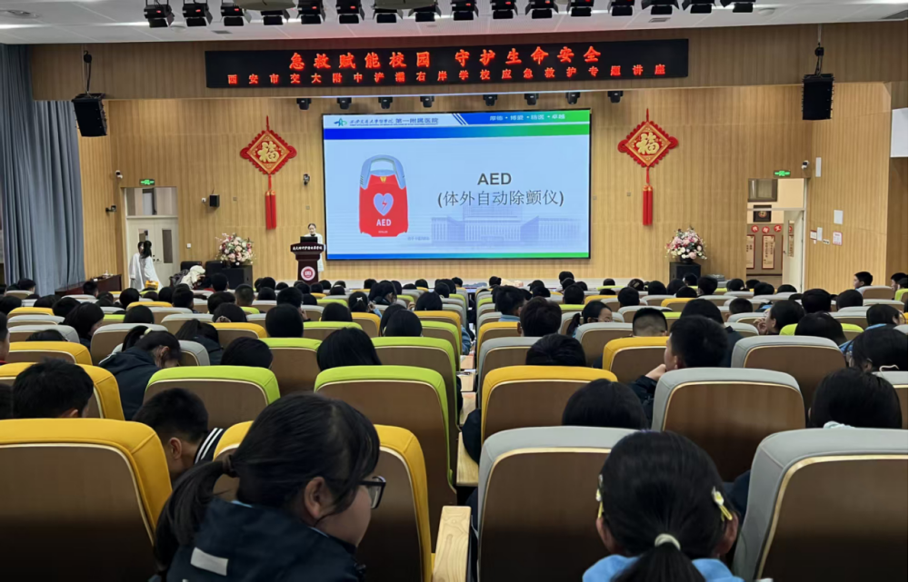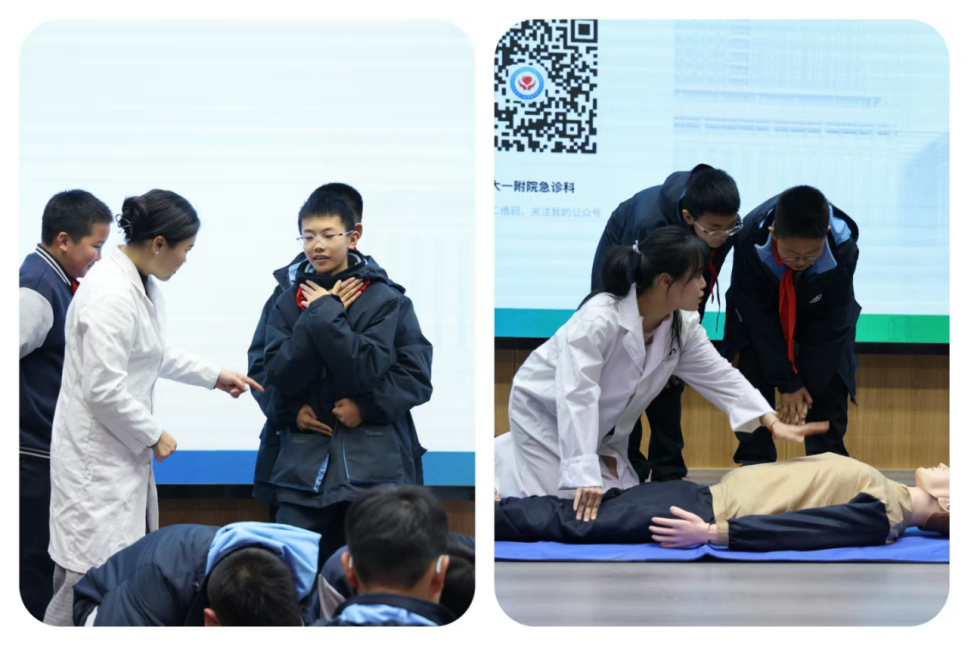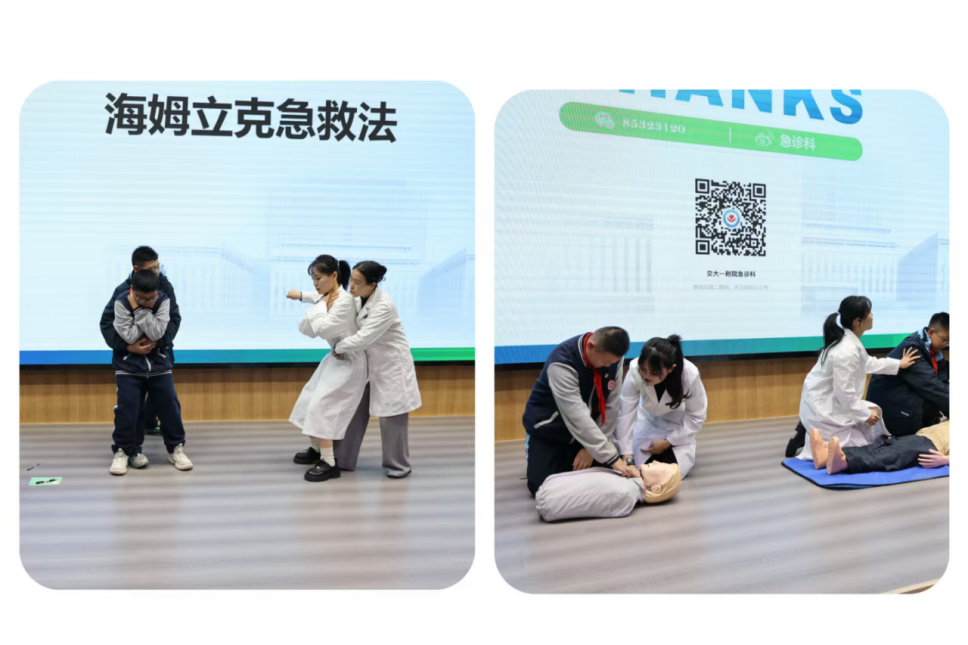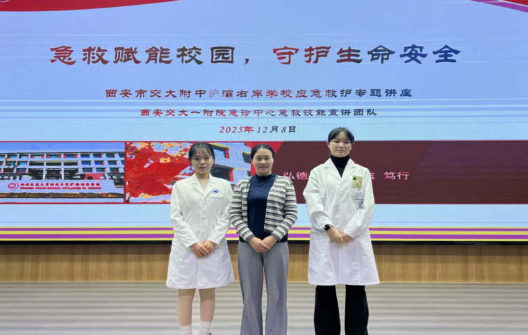 2025年12月8日,一堂关乎生命安全的必修课在交大附中开讲!当日,我院急诊中心急救技能宣讲团队成员彭当丽,南玲玲,王千一受邀走进交大附中,为初一年级的同学们带来了一场生动、实用、意义非凡的急救科普讲座。此次讲座,分为理论讲解,模拟演示,现场互动的形式,为同学们揭开急救技能的神秘面纱,赋能大家守护自己、救助她人的能力。